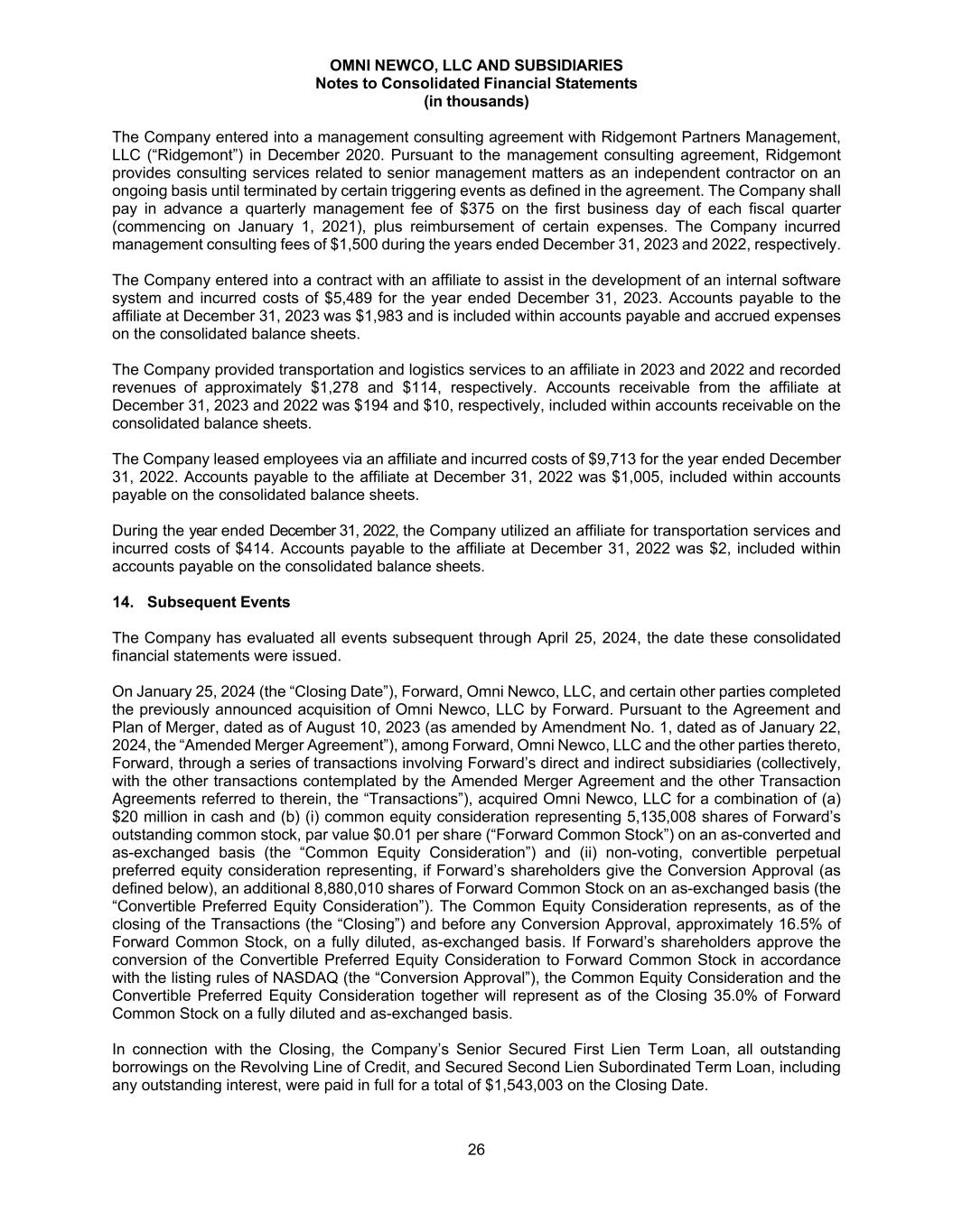 OMNI NEWCO, LLC AND SUBSIDIARIES Notes to Consolidated Financial Statements (in thousands) 26 The Company entered into a management consulting agreement with Ridgemont Partners Management, LLC (“Ridgemont”) in December 2020. Pursuant to the management consulting agreement, Ridgemont provides consulting services related to senior management matters as an independent contractor on an ongoing basis until terminated by certain triggering events as defined in the agreement. The Company shall pay in advance a quarterly management fee of $375 on the first business day of each fiscal quarter (commencing on January 1, 2021), plus reimbursement of certain expenses. The Company incurred management consulting fees of $1,500 during the years ended December 31, 2023 and 2022, respectively. The Company entered into a contract with an affiliate to assist in the development of an internal software system and incurred costs of $5,489 for the year ended December 31, 2023. Accounts payable to the affiliate at December 31, 2023 was $1,983 and is included within accounts payable and accrued expenses on the consolidated balance sheets. The Company provided transportation and logistics services to an affiliate in 2023 and 2022 and recorded revenues of approximately $1,278 and $114, respectively. Accounts receivable from the affiliate at December 31, 2023 and 2022 was $194 and $10, respectively, included within accounts receivable on the consolidated balance sheets. The Company leased employees via an affiliate and incurred costs of $9,713 for the year ended December 31, 2022. Accounts payable to the affiliate at December 31, 2022 was $1,005, included within accounts payable on the consolidated balance sheets. During the year ended December 31, 2022, the Company utilized an affiliate for transportation services and incurred costs of $414. Accounts payable to the affiliate at December 31, 2022 was $2, included within accounts payable on the consolidated balance sheets. 14. Subsequent Events The Company has evaluated all events subsequent through April 25, 2024, the date these consolidated financial statements were issued. On January 25, 2024 (the “Closing Date”), Forward, Omni Newco, LLC, and certain other parties completed the previously announced acquisition of Omni Newco, LLC by Forward. Pursuant to the Agreement and Plan of Merger, dated as of August 10, 2023 (as amended by Amendment No. 1, dated as of January 22, 2024, the “Amended Merger Agreement”), among Forward, Omni Newco, LLC and the other parties thereto, Forward, through a series of transactions involving Forward’s direct and indirect subsidiaries (collectively, with the other transactions contemplated by the Amended Merger Agreement and the other Transaction Agreements referred to therein, the “Transactions”), acquired Omni Newco, LLC for a combination of (a) $20 million in cash and (b) (i) common equity consideration representing 5,135,008 shares of Forward’s outstanding common stock, par value $0.01 per share (“Forward Common Stock”) on an as-converted and as-exchanged basis (the “Common Equity Consideration”) and (ii) non-voting, convertible perpetual preferred equity consideration representing, if Forward’s shareholders give the Conversion Approval (as defined below), an additional 8,880,010 shares of Forward Common Stock on an as-exchanged basis (the “Convertible Preferred Equity Consideration”). The Common Equity Consideration represents, as of the closing of the Transactions (the “Closing”) and before any Conversion Approval, approximately 16.5% of Forward Common Stock, on a fully diluted, as-exchanged basis. If Forward’s shareholders approve the conversion of the Convertible Preferred Equity Consideration to Forward Common Stock in accordance with the listing rules of NASDAQ (the “Conversion Approval”), the Common Equity Consideration and the Convertible Preferred Equity Consideration together will represent as of the Closing 35.0% of Forward Common Stock on a fully diluted and as-exchanged basis. In connection with the Closing, the Company’s Senior Secured First Lien Term Loan, all outstanding borrowings on the Revolving Line of Credit, and Secured Second Lien Subordinated Term Loan, including any outstanding interest, were paid in full for a total of $1,543,003 on the Closing Date.