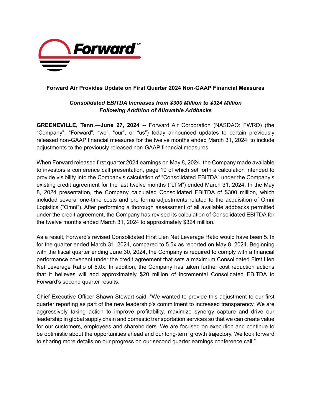 Forward Air Provides Update on First Quarter 2024 Non-GAAP Financial Measures Consolidated EBITDA Increases from $300 Million to $324 Million Following Addition of Allowable Addbacks GREENEVILLE, Tenn.—June 27, 2024 -- Forward Air Corporation (NASDAQ: FWRD) (the “Company”, “Forward”, “we”, “our”, or “us”) today announced updates to certain previously released non-GAAP financial measures for the twelve months ended March 31, 2024, to include adjustments to the previously released non-GAAP financial measures. When Forward released first quarter 2024 earnings on May 8, 2024, the Company made available to investors a conference call presentation, page 19 of which set forth a calculation intended to provide visibility into the Company’s calculation of “Consolidated EBITDA” under the Company’s existing credit agreement for the last twelve months (“LTM”) ended March 31, 2024. In the May 8, 2024 presentation, the Company calculated Consolidated EBITDA of $300 million, which included several one-time costs and pro forma adjustments related to the acquisition of Omni Logistics (“Omni”). After performing a thorough assessment of all available addbacks permitted under the credit agreement, the Company has revised its calculation of Consolidated EBITDA for the twelve months ended March 31, 2024 to approximately $324 million. As a result, Forward’s revised Consolidated First Lien Net Leverage Ratio would have been 5.1x for the quarter ended March 31, 2024, compared to 5.5x as reported on May 8, 2024. Beginning with the fiscal quarter ending June 30, 2024, the Company is required to comply with a financial performance covenant under the credit agreement that sets a maximum Consolidated First Lien Net Leverage Ratio of 6.0x. In addition, the Company has taken further cost reduction actions that it believes will add approximately $20 million of incremental Consolidated EBITDA to Forward’s second quarter results. Chief Executive Officer Shawn Stewart said, “We wanted to provide this adjustment to our first quarter reporting as part of the new leadership’s commitment to increased transparency. We are aggressively taking action to improve profitability, maximize synergy capture and drive our leadership in global supply chain and domestic transportation services so that we can create value for our customers, employees and shareholders. We are focused on execution and continue to be optimistic about the opportunities ahead and our long-term growth trajectory. We look forward to sharing more details on our progress on our second quarter earnings conference call.”