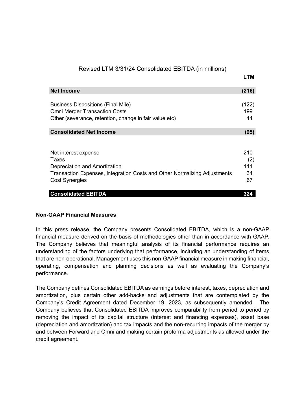 Revised LTM 3/31/24 Consolidated EBITDA (in millions) Non-GAAP Financial Measures In this press release, the Company presents Consolidated EBITDA, which is a non-GAAP financial measure derived on the basis of methodologies other than in accordance with GAAP. The Company believes that meaningful analysis of its financial performance requires an understanding of the factors underlying that performance, including an understanding of items that are non-operational. Management uses this non-GAAP financial measure in making financial, operating, compensation and planning decisions as well as evaluating the Company’s performance. The Company defines Consolidated EBITDA as earnings before interest, taxes, depreciation and amortization, plus certain other add-backs and adjustments that are contemplated by the Company’s Credit Agreement dated December 19, 2023, as subsequently amended. The Company believes that Consolidated EBITDA improves comparability from period to period by removing the impact of its capital structure (interest and financing expenses), asset base (depreciation and amortization) and tax impacts and the non-recurring impacts of the merger by and between Forward and Omni and making certain proforma adjustments as allowed under the credit agreement. LTM Net Income (216) Business Dispositions (Final Mile) (122) Omni Merger Transaction Costs 199 Other (severance, retention, change in fair value etc) 44 Consolidated Net Income (95) Net interest expense 210 Taxes (2) Depreciation and Amortization 111 Transaction Expenses, Integration Costs and Other Normalizing Adjustments 34 Cost Synergies 67 Consolidated EBITDA 324