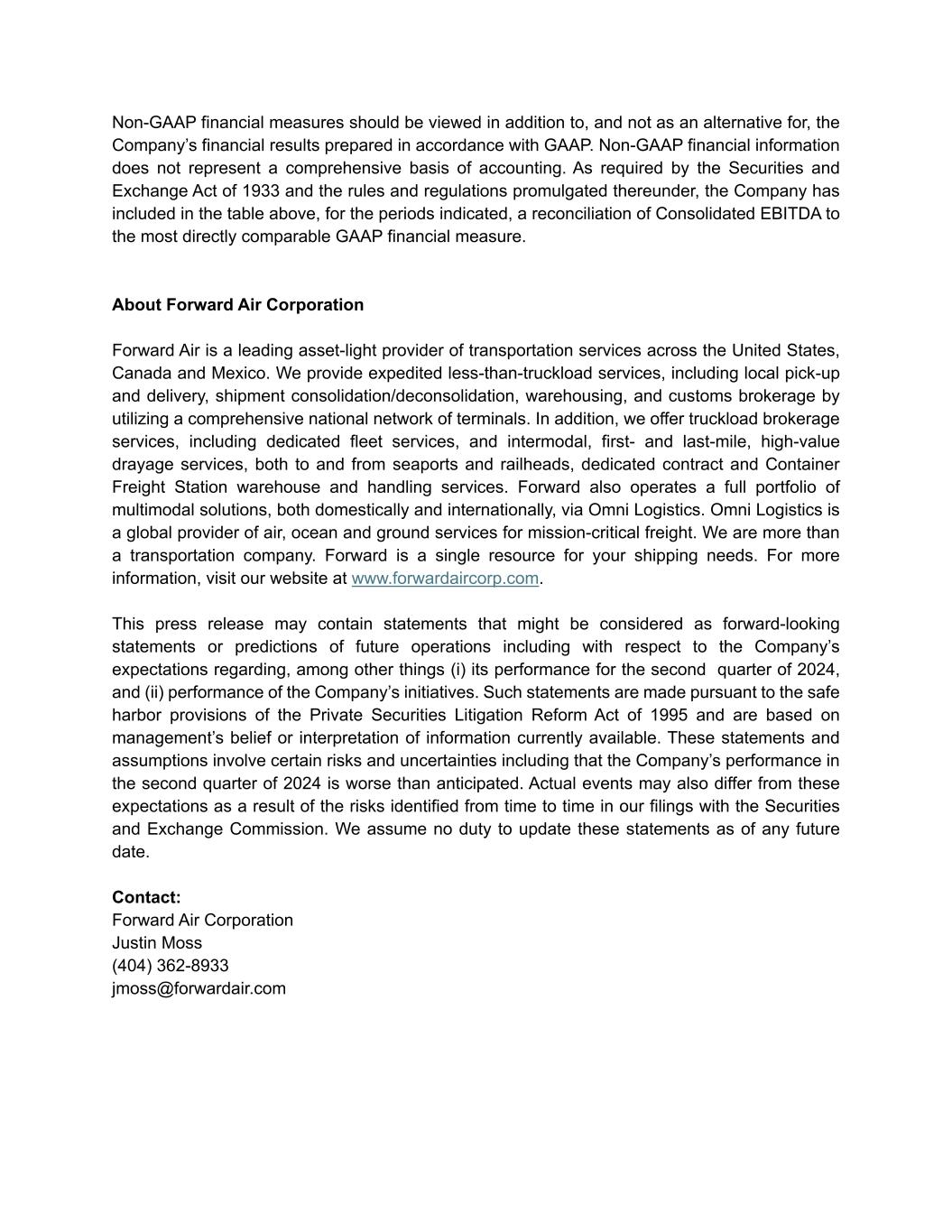 Non-GAAP financial measures should be viewed in addition to, and not as an alternative for, the Company’s financial results prepared in accordance with GAAP. Non-GAAP financial information does not represent a comprehensive basis of accounting. As required by the Securities and Exchange Act of 1933 and the rules and regulations promulgated thereunder, the Company has included in the table above, for the periods indicated, a reconciliation of Consolidated EBITDA to the most directly comparable GAAP financial measure. About Forward Air Corporation Forward Air is a leading asset-light provider of transportation services across the United States, Canada and Mexico. We provide expedited less-than-truckload services, including local pick-up and delivery, shipment consolidation/deconsolidation, warehousing, and customs brokerage by utilizing a comprehensive national network of terminals. In addition, we offer truckload brokerage services, including dedicated fleet services, and intermodal, first- and last-mile, high-value drayage services, both to and from seaports and railheads, dedicated contract and Container Freight Station warehouse and handling services. Forward also operates a full portfolio of multimodal solutions, both domestically and internationally, via Omni Logistics. Omni Logistics is a global provider of air, ocean and ground services for mission-critical freight. We are more than a transportation company. Forward is a single resource for your shipping needs. For more information, visit our website at www.forwardaircorp.com. This press release may contain statements that might be considered as forward-looking statements or predictions of future operations including with respect to the Company’s expectations regarding, among other things (i) its performance for the second quarter of 2024, and (ii) performance of the Company’s initiatives. Such statements are made pursuant to the safe harbor provisions of the Private Securities Litigation Reform Act of 1995 and are based on management’s belief or interpretation of information currently available. These statements and assumptions involve certain risks and uncertainties including that the Company’s performance in the second quarter of 2024 is worse than anticipated. Actual events may also differ from these expectations as a result of the risks identified from time to time in our filings with the Securities and Exchange Commission. We assume no duty to update these statements as of any future date. Contact: Forward Air Corporation Justin Moss (404) 362-8933 jmoss@forwardair.com