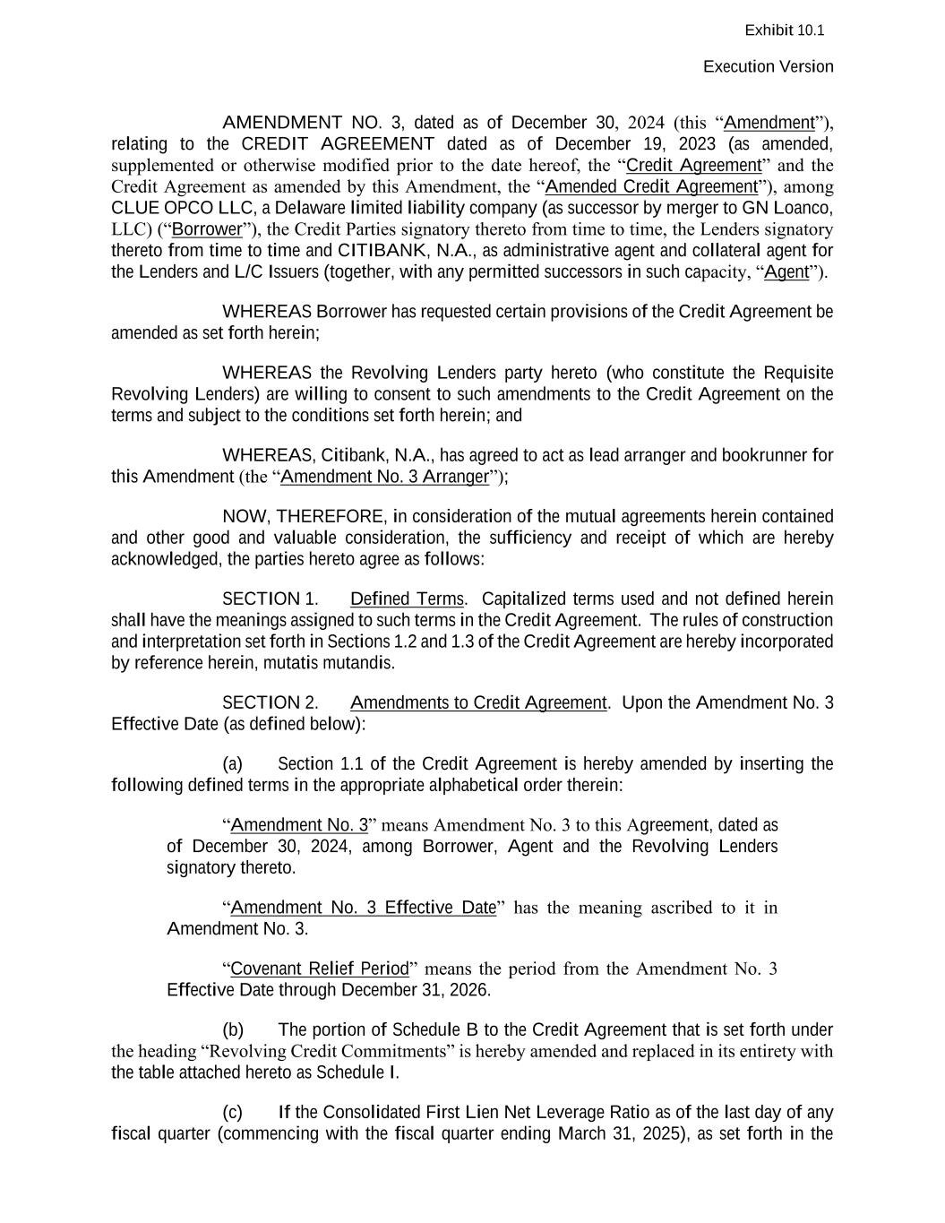 Exhibit 10.1 Execution Version AMENDMENT NO. 3, dated as of December 30, 2024 (this “Amendment”), relating to the CREDIT AGREEMENT dated as of December 19, 2023 (as amended, supplemented or otherwise modified prior to the date hereof, the “Credit Agreement” and the Credit Agreement as amended by this Amendment, the “Amended Credit Agreement”), among CLUE OPCO LLC, a Delaware limited liability company (as successor by merger to GN Loanco, LLC) (“Borrower”), the Credit Parties signatory thereto from time to time, the Lenders signatory thereto from time to time and CITIBANK, N.A., as administrative agent and collateral agent for the Lenders and L/C Issuers (together, with any permitted successors in such capacity, “Agent”). WHEREAS Borrower has requested certain provisions of the Credit Agreement be amended as set forth herein; WHEREAS the Revolving Lenders party hereto (who constitute the Requisite Revolving Lenders) are willing to consent to such amendments to the Credit Agreement on the terms and subject to the conditions set forth herein; and WHEREAS, Citibank, N.A., has agreed to act as lead arranger and bookrunner for this Amendment (the “Amendment No. 3 Arranger”); NOW, THEREFORE, in consideration of the mutual agreements herein contained and other good and valuable consideration, the sufficiency and receipt of which are hereby acknowledged, the parties hereto agree as follows: SECTION 1. Defined Terms. Capitalized terms used and not defined herein shall have the meanings assigned to such terms in the Credit Agreement. The rules of construction and interpretation set forth in Sections 1.2 and 1.3 of the Credit Agreement are hereby incorporated by reference herein, mutatis mutandis. SECTION 2. Amendments to Credit Agreement. Upon the Amendment No. 3 Effective Date (as defined below): (a) Section 1.1 of the Credit Agreement is hereby amended by inserting the following defined terms in the appropriate alphabetical order therein: “Amendment No. 3” means Amendment No. 3 to this Agreement, dated as of December 30, 2024, among Borrower, Agent and the Revolving Lenders signatory thereto. “Amendment No. 3 Effective Date” has the meaning ascribed to it in Amendment No. 3. “Covenant Relief Period” means the period from the Amendment No. 3 Effective Date through December 31, 2026. (b) The portion of Schedule B to the Credit Agreement that is set forth under the heading “Revolving Credit Commitments” is hereby amended and replaced in its entirety with the table attached hereto as Schedule I. (c) If the Consolidated First Lien Net Leverage Ratio as of the last day of any fiscal quarter (commencing with the fiscal quarter ending March 31, 2025), as set forth in the