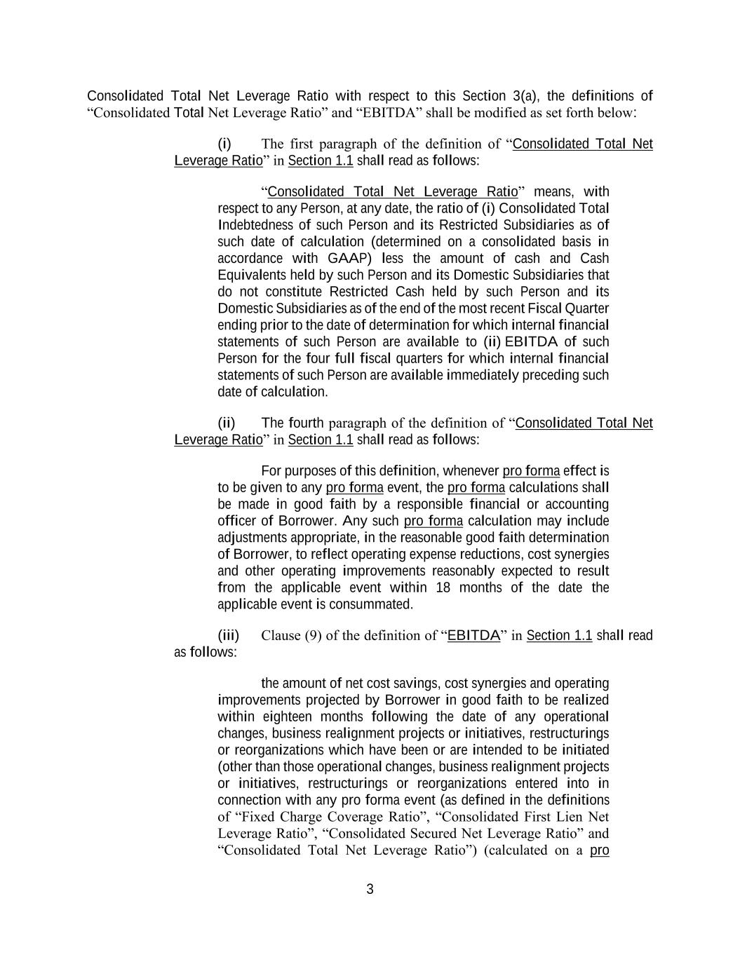 3 Consolidated Total Net Leverage Ratio with respect to this Section 3(a), the definitions of “Consolidated Total Net Leverage Ratio” and “EBITDA” shall be modified as set forth below: (i) The first paragraph of the definition of “Consolidated Total Net Leverage Ratio” in Section 1.1 shall read as follows: “Consolidated Total Net Leverage Ratio” means, with respect to any Person, at any date, the ratio of (i) Consolidated Total Indebtedness of such Person and its Restricted Subsidiaries as of such date of calculation (determined on a consolidated basis in accordance with GAAP) less the amount of cash and Cash Equivalents held by such Person and its Domestic Subsidiaries that do not constitute Restricted Cash held by such Person and its Domestic Subsidiaries as of the end of the most recent Fiscal Quarter ending prior to the date of determination for which internal financial statements of such Person are available to (ii) EBITDA of such Person for the four full fiscal quarters for which internal financial statements of such Person are available immediately preceding such date of calculation. (ii) The fourth paragraph of the definition of “Consolidated Total Net Leverage Ratio” in Section 1.1 shall read as follows: For purposes of this definition, whenever pro forma effect is to be given to any pro forma event, the pro forma calculations shall be made in good faith by a responsible financial or accounting officer of Borrower. Any such pro forma calculation may include adjustments appropriate, in the reasonable good faith determination of Borrower, to reflect operating expense reductions, cost synergies and other operating improvements reasonably expected to result from the applicable event within 18 months of the date the applicable event is consummated. (iii) Clause (9) of the definition of “EBITDA” in Section 1.1 shall read as follows: the amount of net cost savings, cost synergies and operating improvements projected by Borrower in good faith to be realized within eighteen months following the date of any operational changes, business realignment projects or initiatives, restructurings or reorganizations which have been or are intended to be initiated (other than those operational changes, business realignment projects or initiatives, restructurings or reorganizations entered into in connection with any pro forma event (as defined in the definitions of “Fixed Charge Coverage Ratio”, “Consolidated First Lien Net Leverage Ratio”, “Consolidated Secured Net Leverage Ratio” and “Consolidated Total Net Leverage Ratio”) (calculated on a pro