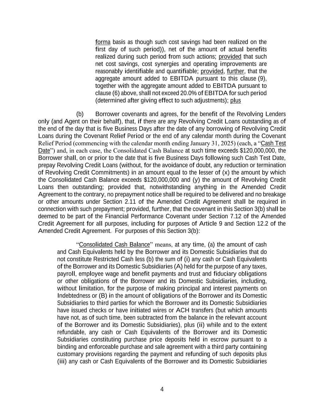 4 forma basis as though such cost savings had been realized on the first day of such period)), net of the amount of actual benefits realized during such period from such actions; provided that such net cost savings, cost synergies and operating improvements are reasonably identifiable and quantifiable; provided, further, that the aggregate amount added to EBITDA pursuant to this clause (9), together with the aggregate amount added to EBITDA pursuant to clause (6) above, shall not exceed 20.0% of EBITDA for such period (determined after giving effect to such adjustments); plus (b) Borrower covenants and agrees, for the benefit of the Revolving Lenders only (and Agent on their behalf), that, if there are any Revolving Credit Loans outstanding as of the end of the day that is five Business Days after the date of any borrowing of Revolving Credit Loans during the Covenant Relief Period or the end of any calendar month during the Covenant Relief Period (commencing with the calendar month ending January 31, 2025) (each, a “Cash Test Date”) and, in each case, the Consolidated Cash Balance at such time exceeds $120,000,000, the Borrower shall, on or prior to the date that is five Business Days following such Cash Test Date, prepay Revolving Credit Loans (without, for the avoidance of doubt, any reduction or termination of Revolving Credit Commitments) in an amount equal to the lesser of (x) the amount by which the Consolidated Cash Balance exceeds $120,000,000 and (y) the amount of Revolving Credit Loans then outstanding; provided that, notwithstanding anything in the Amended Credit Agreement to the contrary, no prepayment notice shall be required to be delivered and no breakage or other amounts under Section 2.11 of the Amended Credit Agreement shall be required in connection with such prepayment; provided, further, that the covenant in this Section 3(b) shall be deemed to be part of the Financial Performance Covenant under Section 7.12 of the Amended Credit Agreement for all purposes, including for purposes of Article 9 and Section 12.2 of the Amended Credit Agreement. For purposes of this Section 3(b): “Consolidated Cash Balance” means, at any time, (a) the amount of cash and Cash Equivalents held by the Borrower and its Domestic Subsidiaries that do not constitute Restricted Cash less (b) the sum of (i) any cash or Cash Equivalents of the Borrower and its Domestic Subsidiaries (A) held for the purpose of any taxes, payroll, employee wage and benefit payments and trust and fiduciary obligations or other obligations of the Borrower and its Domestic Subsidiaries, including, without limitation, for the purpose of making principal and interest payments on Indebtedness or (B) in the amount of obligations of the Borrower and its Domestic Subsidiaries to third parties for which the Borrower and its Domestic Subsidiaries have issued checks or have initiated wires or ACH transfers (but which amounts have not, as of such time, been subtracted from the balance in the relevant account of the Borrower and its Domestic Subsidiaries), plus (ii) while and to the extent refundable, any cash or Cash Equivalents of the Borrower and its Domestic Subsidiaries constituting purchase price deposits held in escrow pursuant to a binding and enforceable purchase and sale agreement with a third party containing customary provisions regarding the payment and refunding of such deposits plus (iii) any cash or Cash Equivalents of the Borrower and its Domestic Subsidiaries
