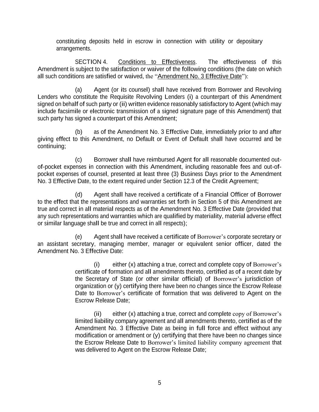 5 constituting deposits held in escrow in connection with utility or depositary arrangements. SECTION 4. Conditions to Effectiveness. The effectiveness of this Amendment is subject to the satisfaction or waiver of the following conditions (the date on which all such conditions are satisfied or waived, the “Amendment No. 3 Effective Date”): (a) Agent (or its counsel) shall have received from Borrower and Revolving Lenders who constitute the Requisite Revolving Lenders (i) a counterpart of this Amendment signed on behalf of such party or (ii) written evidence reasonably satisfactory to Agent (which may include facsimile or electronic transmission of a signed signature page of this Amendment) that such party has signed a counterpart of this Amendment; (b) as of the Amendment No. 3 Effective Date, immediately prior to and after giving effect to this Amendment, no Default or Event of Default shall have occurred and be continuing; (c) Borrower shall have reimbursed Agent for all reasonable documented out- of-pocket expenses in connection with this Amendment, including reasonable fees and out-of- pocket expenses of counsel, presented at least three (3) Business Days prior to the Amendment No. 3 Effective Date, to the extent required under Section 12.3 of the Credit Agreement; (d) Agent shall have received a certificate of a Financial Officer of Borrower to the effect that the representations and warranties set forth in Section 5 of this Amendment are true and correct in all material respects as of the Amendment No. 3 Effective Date (provided that any such representations and warranties which are qualified by materiality, material adverse effect or similar language shall be true and correct in all respects); (e) Agent shall have received a certificate of Borrower’s corporate secretary or an assistant secretary, managing member, manager or equivalent senior officer, dated the Amendment No. 3 Effective Date: (i) either (x) attaching a true, correct and complete copy of Borrower’s certificate of formation and all amendments thereto, certified as of a recent date by the Secretary of State (or other similar official) of Borrower’s jurisdiction of organization or (y) certifying there have been no changes since the Escrow Release Date to Borrower’s certificate of formation that was delivered to Agent on the Escrow Release Date; (ii) either (x) attaching a true, correct and complete copy of Borrower’s limited liability company agreement and all amendments thereto, certified as of the Amendment No. 3 Effective Date as being in full force and effect without any modification or amendment or (y) certifying that there have been no changes since the Escrow Release Date to Borrower’s limited liability company agreement that was delivered to Agent on the Escrow Release Date;