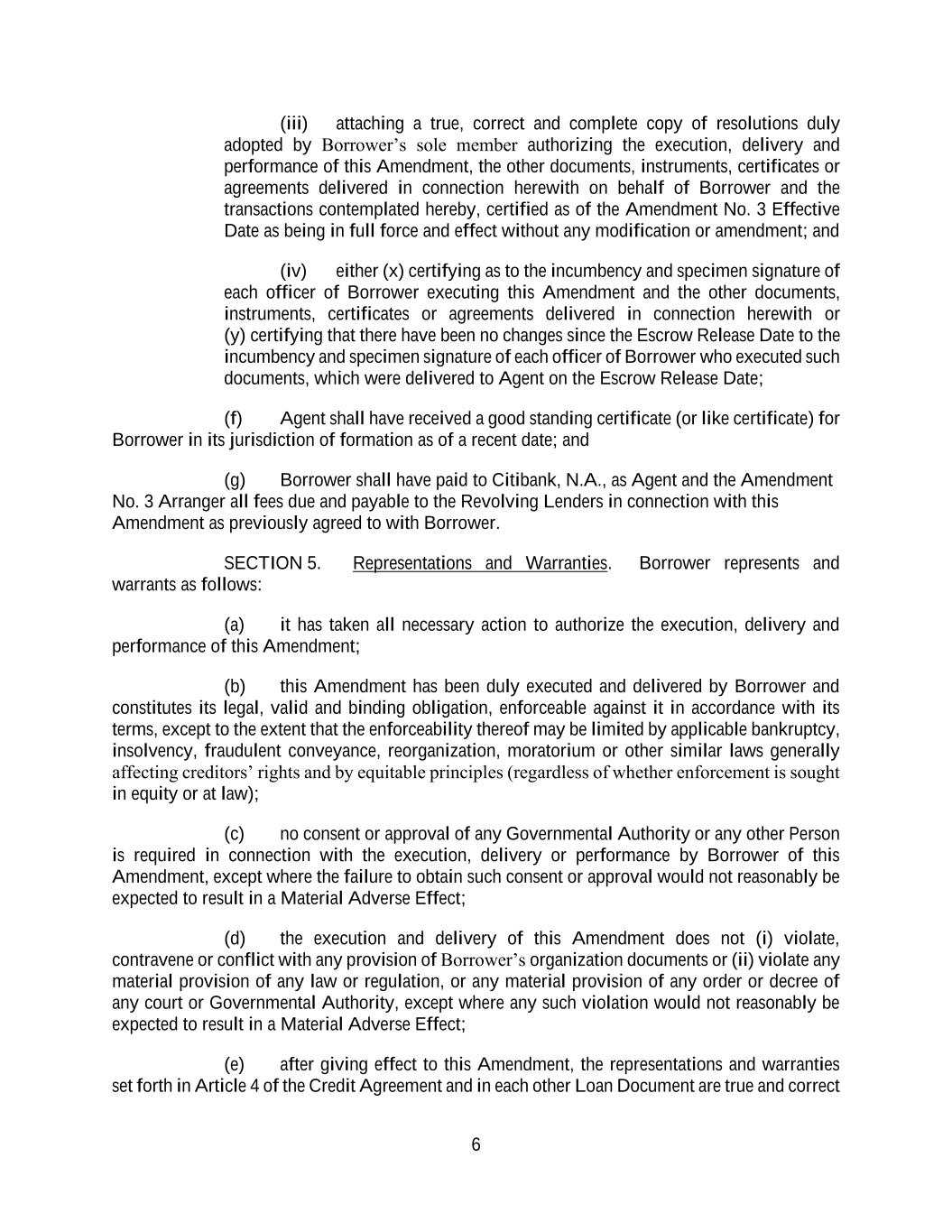 6 (iii) attaching a true, correct and complete copy of resolutions duly adopted by Borrower’s sole member authorizing the execution, delivery and performance of this Amendment, the other documents, instruments, certificates or agreements delivered in connection herewith on behalf of Borrower and the transactions contemplated hereby, certified as of the Amendment No. 3 Effective Date as being in full force and effect without any modification or amendment; and (iv) either (x) certifying as to the incumbency and specimen signature of each officer of Borrower executing this Amendment and the other documents, instruments, certificates or agreements delivered in connection herewith or (y) certifying that there have been no changes since the Escrow Release Date to the incumbency and specimen signature of each officer of Borrower who executed such documents, which were delivered to Agent on the Escrow Release Date; (f) Agent shall have received a good standing certificate (or like certificate) for Borrower in its jurisdiction of formation as of a recent date; and (g) Borrower shall have paid to Citibank, N.A., as Agent and the Amendment No. 3 Arranger all fees due and payable to the Revolving Lenders in connection with this Amendment as previously agreed to with Borrower. SECTION 5. Representations and Warranties. Borrower represents and warrants as follows: (a) it has taken all necessary action to authorize the execution, delivery and performance of this Amendment; (b) this Amendment has been duly executed and delivered by Borrower and constitutes its legal, valid and binding obligation, enforceable against it in accordance with its terms, except to the extent that the enforceability thereof may be limited by applicable bankruptcy, insolvency, fraudulent conveyance, reorganization, moratorium or other similar laws generally affecting creditors’ rights and by equitable principles (regardless of whether enforcement is sought in equity or at law); (c) no consent or approval of any Governmental Authority or any other Person is required in connection with the execution, delivery or performance by Borrower of this Amendment, except where the failure to obtain such consent or approval would not reasonably be expected to result in a Material Adverse Effect; (d) the execution and delivery of this Amendment does not (i) violate, contravene or conflict with any provision of Borrower’s organization documents or (ii) violate any material provision of any law or regulation, or any material provision of any order or decree of any court or Governmental Authority, except where any such violation would not reasonably be expected to result in a Material Adverse Effect; (e) after giving effect to this Amendment, the representations and warranties set forth in Article 4 of the Credit Agreement and in each other Loan Document are true and correct