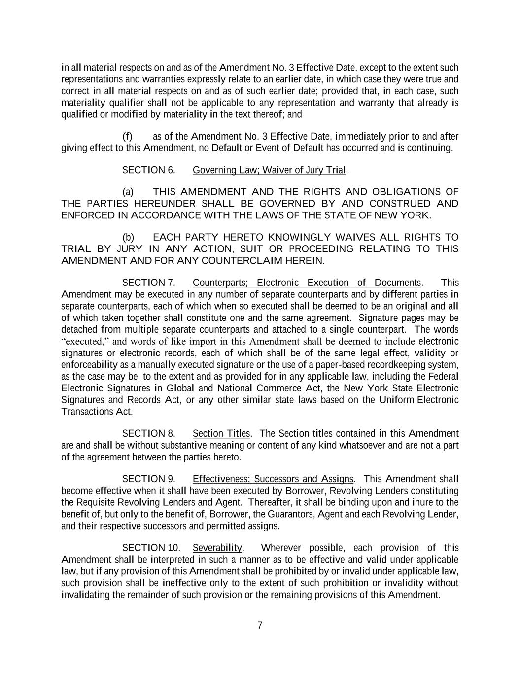 7 in all material respects on and as of the Amendment No. 3 Effective Date, except to the extent such representations and warranties expressly relate to an earlier date, in which case they were true and correct in all material respects on and as of such earlier date; provided that, in each case, such materiality qualifier shall not be applicable to any representation and warranty that already is qualified or modified by materiality in the text thereof; and (f) as of the Amendment No. 3 Effective Date, immediately prior to and after giving effect to this Amendment, no Default or Event of Default has occurred and is continuing. SECTION 6. Governing Law; Waiver of Jury Trial. (a) THIS AMENDMENT AND THE RIGHTS AND OBLIGATIONS OF THE PARTIES HEREUNDER SHALL BE GOVERNED BY AND CONSTRUED AND ENFORCED IN ACCORDANCE WITH THE LAWS OF THE STATE OF NEW YORK. (b) EACH PARTY HERETO KNOWINGLY WAIVES ALL RIGHTS TO TRIAL BY JURY IN ANY ACTION, SUIT OR PROCEEDING RELATING TO THIS AMENDMENT AND FOR ANY COUNTERCLAIM HEREIN. SECTION 7. Counterparts; Electronic Execution of Documents. This Amendment may be executed in any number of separate counterparts and by different parties in separate counterparts, each of which when so executed shall be deemed to be an original and all of which taken together shall constitute one and the same agreement. Signature pages may be detached from multiple separate counterparts and attached to a single counterpart. The words “executed,” and words of like import in this Amendment shall be deemed to include electronic signatures or electronic records, each of which shall be of the same legal effect, validity or enforceability as a manually executed signature or the use of a paper-based recordkeeping system, as the case may be, to the extent and as provided for in any applicable law, including the Federal Electronic Signatures in Global and National Commerce Act, the New York State Electronic Signatures and Records Act, or any other similar state laws based on the Uniform Electronic Transactions Act. SECTION 8. Section Titles. The Section titles contained in this Amendment are and shall be without substantive meaning or content of any kind whatsoever and are not a part of the agreement between the parties hereto. SECTION 9. Effectiveness; Successors and Assigns. This Amendment shall become effective when it shall have been executed by Borrower, Revolving Lenders constituting the Requisite Revolving Lenders and Agent. Thereafter, it shall be binding upon and inure to the benefit of, but only to the benefit of, Borrower, the Guarantors, Agent and each Revolving Lender, and their respective successors and permitted assigns. SECTION 10. Severability. Wherever possible, each provision of this Amendment shall be interpreted in such a manner as to be effective and valid under applicable law, but if any provision of this Amendment shall be prohibited by or invalid under applicable law, such provision shall be ineffective only to the extent of such prohibition or invalidity without invalidating the remainder of such provision or the remaining provisions of this Amendment.