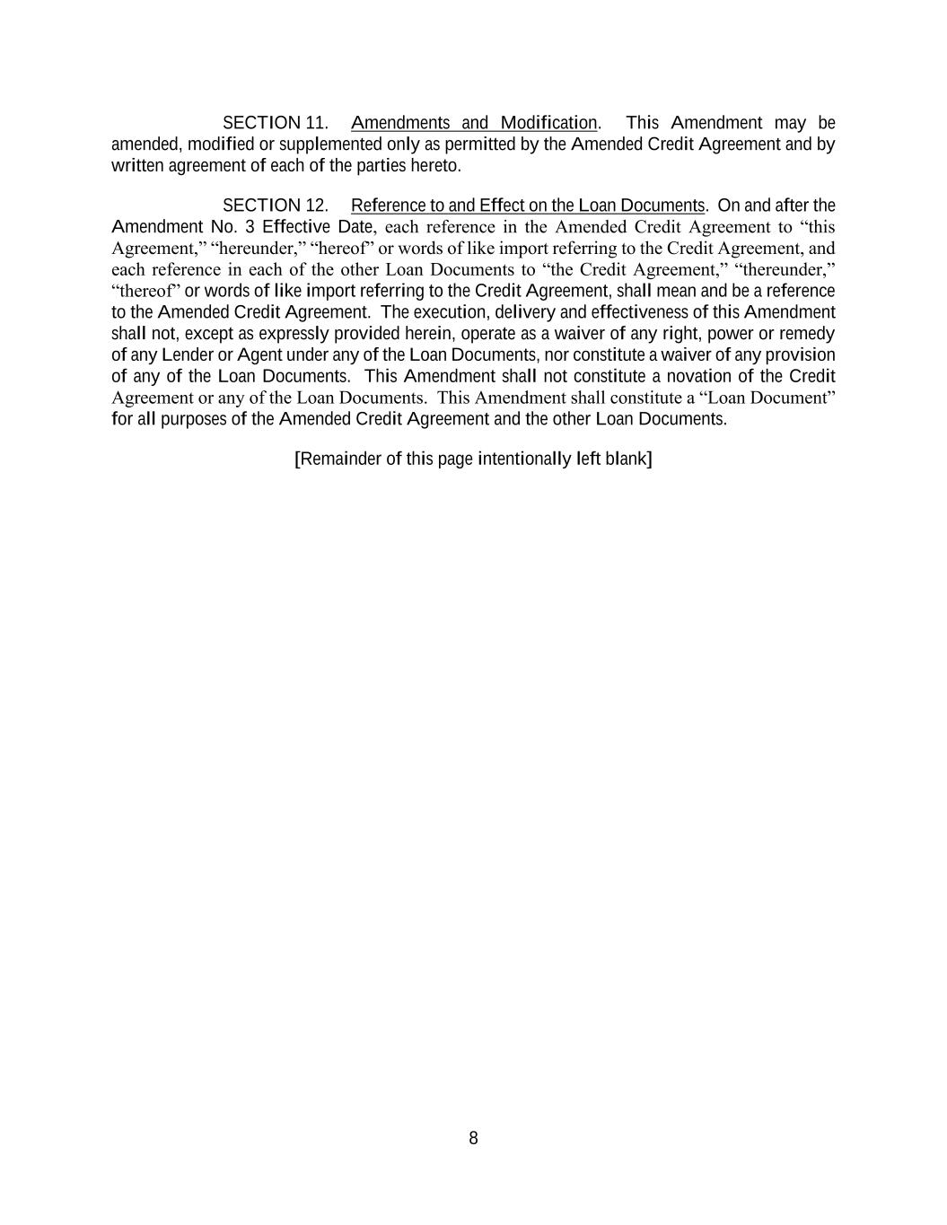 8 SECTION 11. Amendments and Modification. This Amendment may be amended, modified or supplemented only as permitted by the Amended Credit Agreement and by written agreement of each of the parties hereto. SECTION 12. Reference to and Effect on the Loan Documents. On and after the Amendment No. 3 Effective Date, each reference in the Amended Credit Agreement to “this Agreement,” “hereunder,” “hereof” or words of like import referring to the Credit Agreement, and each reference in each of the other Loan Documents to “the Credit Agreement,” “thereunder,” “thereof” or words of like import referring to the Credit Agreement, shall mean and be a reference to the Amended Credit Agreement. The execution, delivery and effectiveness of this Amendment shall not, except as expressly provided herein, operate as a waiver of any right, power or remedy of any Lender or Agent under any of the Loan Documents, nor constitute a waiver of any provision of any of the Loan Documents. This Amendment shall not constitute a novation of the Credit Agreement or any of the Loan Documents. This Amendment shall constitute a “Loan Document” for all purposes of the Amended Credit Agreement and the other Loan Documents. [Remainder of this page intentionally left blank]