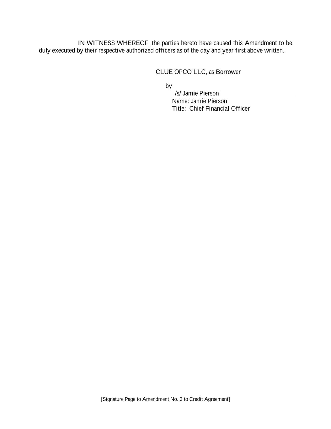 [Signature Page to Amendment No. 3 to Credit Agreement] IN WITNESS WHEREOF, the parties hereto have caused this Amendment to be duly executed by their respective authorized officers as of the day and year first above written. CLUE OPCO LLC, as Borrower by /s/ Jamie Pierson Name: Jamie Pierson Title: Chief Financial Officer