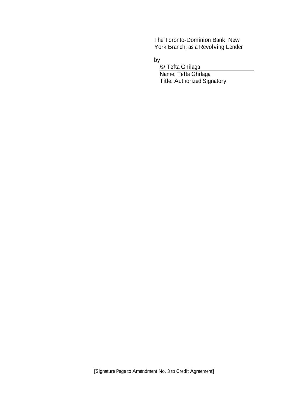 [Signature Page to Amendment No. 3 to Credit Agreement] The Toronto-Dominion Bank, New York Branch, as a Revolving Lender by /s/ Tefta Ghilaga Name: Tefta Ghilaga Title: Authorized Signatory
