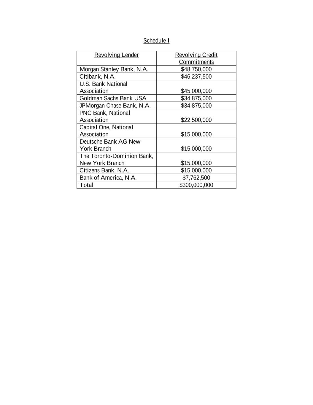 Schedule I Revolving Lender Revolving Credit Commitments Morgan Stanley Bank, N.A. $48,750,000 Citibank, N.A. $46,237,500 U.S. Bank National Association $45,000,000 Goldman Sachs Bank USA $34,875,000 JPMorgan Chase Bank, N.A. $34,875,000 PNC Bank, National Association $22,500,000 Capital One, National Association $15,000,000 Deutsche Bank AG New York Branch $15,000,000 The Toronto-Dominion Bank, New York Branch $15,000,000 Citizens Bank, N.A. $15,000,000 Bank of America, N.A. $7,762,500 Total $300,000,000