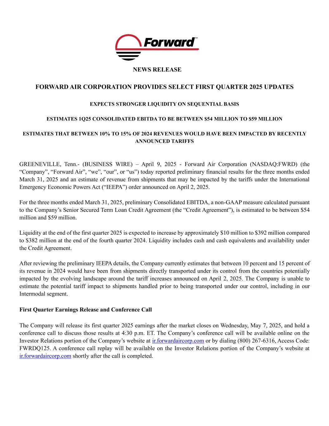 NEWS RELEASE FORWARD AIR CORPORATION PROVIDES SELECT FIRST QUARTER 2025 UPDATES EXPECTS STRONGER LIQUIDITY ON SEQUENTIAL BASIS ESTIMATES 1Q25 CONSOLIDATED EBITDA TO BE BETWEEN $54 MILLION TO $59 MILLION ESTIMATES THAT BETWEEN 10% TO 15% OF 2024 REVENUES WOULD HAVE BEEN IMPACTED BY RECENTLY ANNOUNCED TARIFFS GREENEVILLE, Tenn.- (BUSINESS WIRE) – April 9, 2025 - Forward Air Corporation (NASDAQ:FWRD) (the “Company”, “Forward Air”, “we”, “our”, or “us”) today reported preliminary financial results for the three months ended March 31, 2025 and an estimate of revenue from shipments that may be impacted by the tariffs under the International Emergency Economic Powers Act (“IEEPA”) order announced on April 2, 2025. For the three months ended March 31, 2025, preliminary Consolidated EBITDA, a non-GAAP measure calculated pursuant to the Company’s Senior Secured Term Loan Credit Agreement (the “Credit Agreement”), is estimated to be between $54 million and $59 million. Liquidity at the end of the first quarter 2025 is expected to increase by approximately $10 million to $392 million compared to $382 million at the end of the fourth quarter 2024. Liquidity includes cash and cash equivalents and availability under the Credit Agreement. After reviewing the preliminary IEEPA details, the Company currently estimates that between 10 percent and 15 percent of its revenue in 2024 would have been from shipments directly transported under its control from the countries potentially impacted by the evolving landscape around the tariff increases announced on April 2, 2025. The Company is unable to estimate the potential tariff impact to shipments handled prior to being transported under our control, including in our Intermodal segment. First Quarter Earnings Release and Conference Call The Company will release its first quarter 2025 earnings after the market closes on Wednesday, May 7, 2025, and hold a conference call to discuss those results at 4:30 p.m. ET. The Company’s conference call will be available online on the Investor Relations portion of the Company’s website at ir.forwardaircorp.com or by dialing (800) 267-6316, Access Code: FWRDQ125. A conference call replay will be available on the Investor Relations portion of the Company’s website at ir.forwardaircorp.com shortly after the call is completed.
