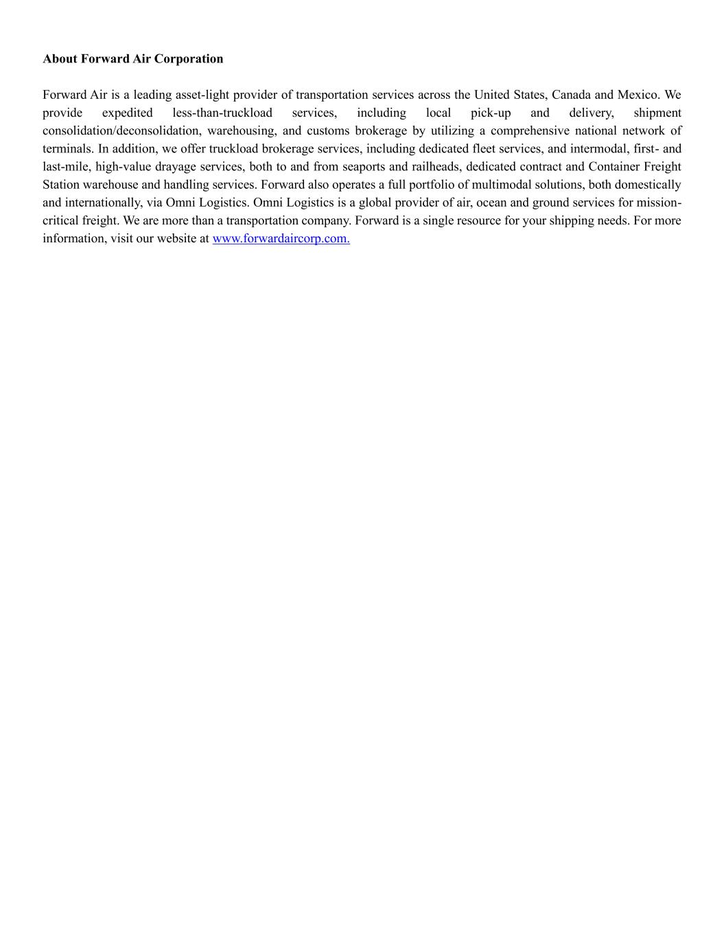 About Forward Air Corporation Forward Air is a leading asset-light provider of transportation services across the United States, Canada and Mexico. We provide expedited less-than-truckload services, including local pick-up and delivery, shipment consolidation/deconsolidation, warehousing, and customs brokerage by utilizing a comprehensive national network of terminals. In addition, we offer truckload brokerage services, including dedicated fleet services, and intermodal, first- and last-mile, high-value drayage services, both to and from seaports and railheads, dedicated contract and Container Freight Station warehouse and handling services. Forward also operates a full portfolio of multimodal solutions, both domestically and internationally, via Omni Logistics. Omni Logistics is a global provider of air, ocean and ground services for mission- critical freight. We are more than a transportation company. Forward is a single resource for your shipping needs. For more information, visit our website at www.forwardaircorp.com.