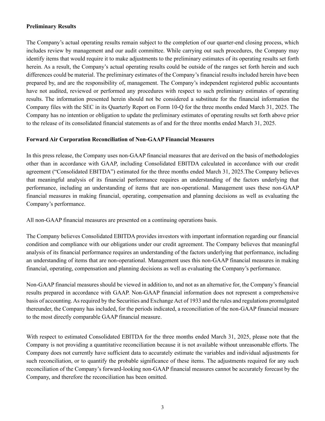 3 Preliminary Results The Company’s actual operating results remain subject to the completion of our quarter-end closing process, which includes review by management and our audit committee. While carrying out such procedures, the Company may identify items that would require it to make adjustments to the preliminary estimates of its operating results set forth herein. As a result, the Company’s actual operating results could be outside of the ranges set forth herein and such differences could be material. The preliminary estimates of the Company’s financial results included herein have been prepared by, and are the responsibility of, management. The Company’s independent registered public accountants have not audited, reviewed or performed any procedures with respect to such preliminary estimates of operating results. The information presented herein should not be considered a substitute for the financial information the Company files with the SEC in its Quarterly Report on Form 10-Q for the three months ended March 31, 2025. The Company has no intention or obligation to update the preliminary estimates of operating results set forth above prior to the release of its consolidated financial statements as of and for the three months ended March 31, 2025. Forward Air Corporation Reconciliation of Non-GAAP Financial Measures In this press release, the Company uses non-GAAP financial measures that are derived on the basis of methodologies other than in accordance with GAAP, including Consolidated EBITDA calculated in accordance with our credit agreement (“Consolidated EBITDA”) estimated for the three months ended March 31, 2025.The Company believes that meaningful analysis of its financial performance requires an understanding of the factors underlying that performance, including an understanding of items that are non-operational. Management uses these non-GAAP financial measures in making financial, operating, compensation and planning decisions as well as evaluating the Company’s performance. All non-GAAP financial measures are presented on a continuing operations basis. The Company believes Consolidated EBITDA provides investors with important information regarding our financial condition and compliance with our obligations under our credit agreement. The Company believes that meaningful analysis of its financial performance requires an understanding of the factors underlying that performance, including an understanding of items that are non-operational. Management uses this non-GAAP financial measures in making financial, operating, compensation and planning decisions as well as evaluating the Company’s performance. Non-GAAP financial measures should be viewed in addition to, and not as an alternative for, the Company’s financial results prepared in accordance with GAAP. Non-GAAP financial information does not represent a comprehensive basis of accounting. As required by the Securities and Exchange Act of 1933 and the rules and regulations promulgated thereunder, the Company has included, for the periods indicated, a reconciliation of the non-GAAP financial measure to the most directly comparable GAAP financial measure. With respect to estimated Consolidated EBITDA for the three months ended March 31, 2025, please note that the Company is not providing a quantitative reconciliation because it is not available without unreasonable efforts. The Company does not currently have sufficient data to accurately estimate the variables and individual adjustments for such reconciliation, or to quantify the probable significance of these items. The adjustments required for any such reconciliation of the Company’s forward-looking non-GAAP financial measures cannot be accurately forecast by the Company, and therefore the reconciliation has been omitted.