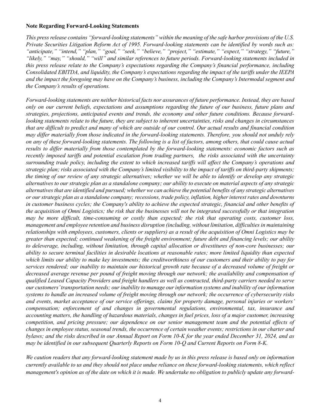 4 Note Regarding Forward-Looking Statements This press release contains “forward-looking statements” within the meaning of the safe harbor provisions of the U.S. Private Securities Litigation Reform Act of 1995. Forward-looking statements can be identified by words such as: “anticipate,” “intend,” “plan,” “goal,” “seek,” “believe,” “project,” “estimate,” “expect,” “strategy,” “future,” “likely,” “may,” “should,” “will” and similar references to future periods. Forward-looking statements included in this press release relate to the Company’s expectations regarding the Company’s financial performance, including Consolidated EBITDA, and liquidity, the Company’s expectations regarding the impact of the tariffs under the IEEPA and the impact the foregoing may have on the Company’s business, including the Company’s Intermodal segment and the Company’s results of operations. Forward-looking statements are neither historical facts nor assurances of future performance. Instead, they are based only on our current beliefs, expectations and assumptions regarding the future of our business, future plans and strategies, projections, anticipated events and trends, the economy and other future conditions. Because forward- looking statements relate to the future, they are subject to inherent uncertainties, risks and changes in circumstances that are difficult to predict and many of which are outside of our control. Our actual results and financial condition may differ materially from those indicated in the forward-looking statements. Therefore, you should not unduly rely on any of these forward-looking statements. The following is a list of factors, among others, that could cause actual results to differ materially from those contemplated by the forward-looking statements: economic factors such as recently imposed tariffs and potential escalation from trading partners, the risks associated with the uncertainty surrounding trade policy, including the extent to which increased tariffs will affect the Company’s operations and strategic plan; risks associated with the Company’s limited visibility to the impact of tariffs on third-party shipments; the timing of our review of any strategic alternatives; whether we will be able to identify or develop any strategic alternatives to our strategic plan as a standalone company; our ability to execute on material aspects of any strategic alternatives that are identified and pursued; whether we can achieve the potential benefits of any strategic alternatives or our strategic plan as a standalone company; recessions, trade policy, inflation, higher interest rates and downturns in customer business cycles; the Company's ability to achieve the expected strategic, financial and other benefits of the acquisition of Omni Logistics; the risk that the businesses will not be integrated successfully or that integration may be more difficult, time-consuming or costly than expected; the risk that operating costs, customer loss, management and employee retention and business disruption (including, without limitation, difficulties in maintaining relationships with employees, customers, clients or suppliers) as a result of the acquisition of Omni Logistics may be greater than expected; continued weakening of the freight environment; future debt and financing levels; our ability to deleverage, including, without limitation, through capital allocation or divestitures of non-core businesses; our ability to secure terminal facilities in desirable locations at reasonable rates; more limited liquidity than expected which limits our ability to make key investments; the creditworthiness of our customers and their ability to pay for services rendered; our inability to maintain our historical growth rate because of a decreased volume of freight or decreased average revenue per pound of freight moving through our network; the availability and compensation of qualified Leased Capacity Providers and freight handlers as well as contracted, third-party carriers needed to serve our customers’ transportation needs; our inability to manage our information systems and inability of our information systems to handle an increased volume of freight moving through our network; the occurrence of cybersecurity risks and events, market acceptance of our service offerings, claims for property damage, personal injuries or workers’ compensation; enforcement of and changes in governmental regulations, environmental, tax, insurance and accounting matters, the handling of hazardous materials, changes in fuel prices, loss of a major customer, increasing competition, and pricing pressure; our dependence on our senior management team and the potential effects of changes in employee status, seasonal trends, the occurrence of certain weather events; restrictions in our charter and bylaws; and the risks described in our Annual Report on Form 10-K for the year ended December 31, 2024, and as may be identified in our subsequent Quarterly Reports on Form 10-Q and Current Reports on Form 8-K. We caution readers that any forward-looking statement made by us in this press release is based only on information currently available to us and they should not place undue reliance on these forward-looking statements, which reflect management's opinion as of the date on which it is made. We undertake no obligation to publicly update any forward-