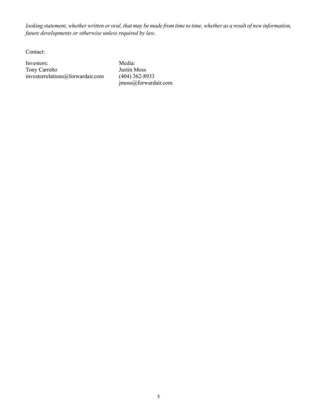 5 looking statement, whether written or oral, that may be made from time to time, whether as a result of new information, future developments or otherwise unless required by law. Contact: Investors: Media: Tony Carreño Justin Moss investorrelations@forwardair.com (404) 362-8933 jmoss@forwardair.com