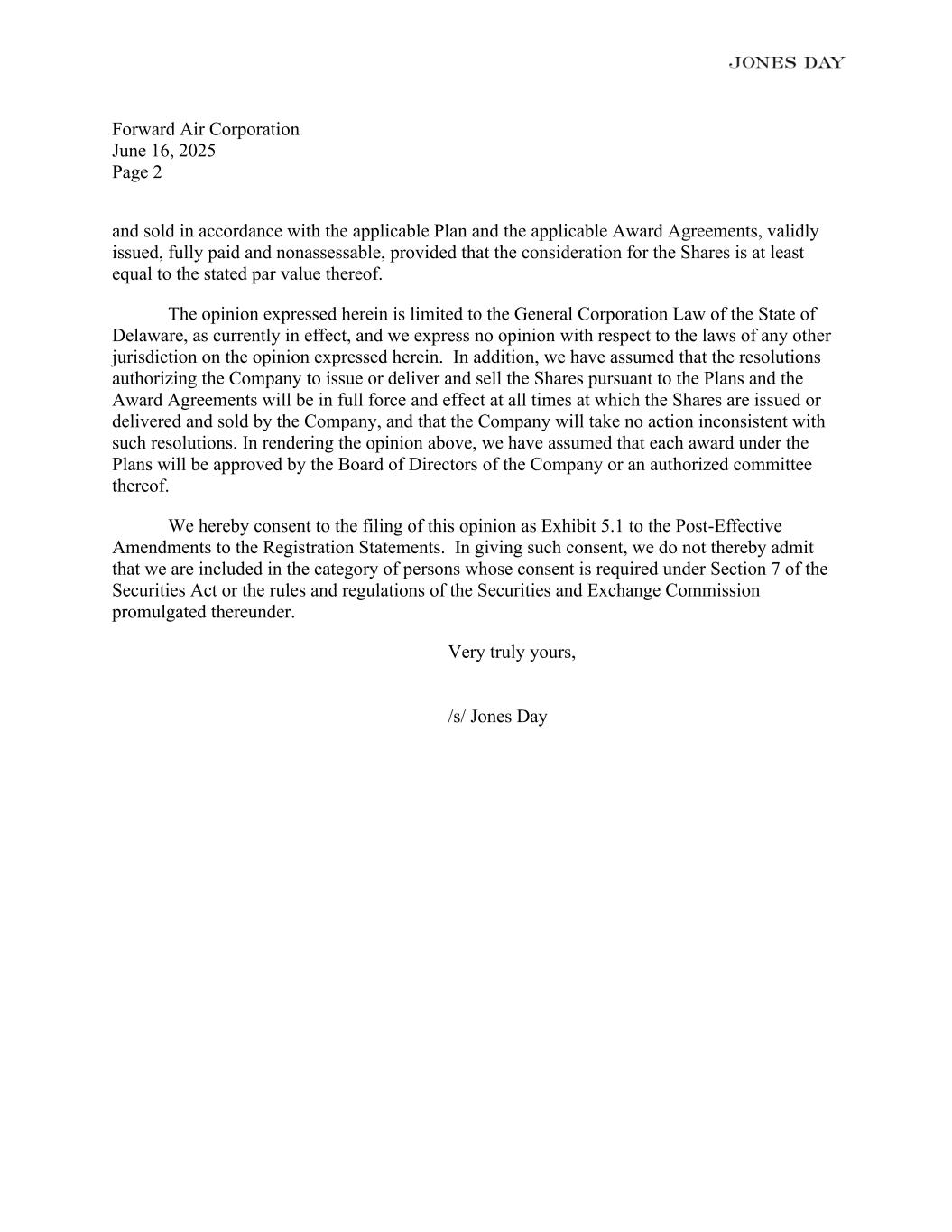 Forward Air Corporation June 16, 2025 Page 2 and sold in accordance with the applicable Plan and the applicable Award Agreements, validly issued, fully paid and nonassessable, provided that the consideration for the Shares is at least equal to the stated par value thereof. The opinion expressed herein is limited to the General Corporation Law of the State of Delaware, as currently in effect, and we express no opinion with respect to the laws of any other jurisdiction on the opinion expressed herein. In addition, we have assumed that the resolutions authorizing the Company to issue or deliver and sell the Shares pursuant to the Plans and the Award Agreements will be in full force and effect at all times at which the Shares are issued or delivered and sold by the Company, and that the Company will take no action inconsistent with such resolutions. In rendering the opinion above, we have assumed that each award under the Plans will be approved by the Board of Directors of the Company or an authorized committee thereof. We hereby consent to the filing of this opinion as Exhibit 5.1 to the Post-Effective Amendments to the Registration Statements. In giving such consent, we do not thereby admit that we are included in the category of persons whose consent is required under Section 7 of the Securities Act or the rules and regulations of the Securities and Exchange Commission promulgated thereunder. Very truly yours, /s/ Jones Day