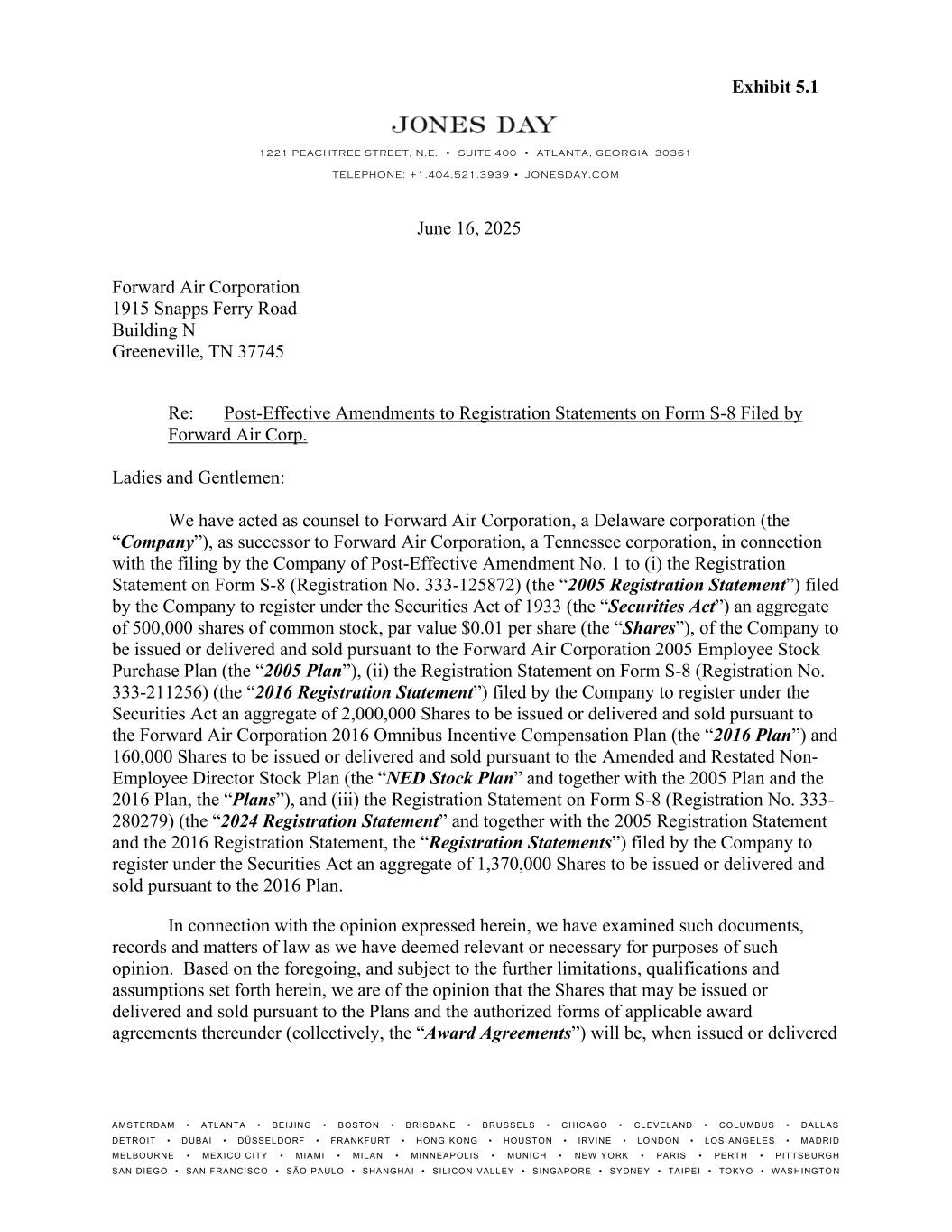 Forward Air Corporation June 16, 2025 Page 2 and sold in accordance with the applicable Plan and the applicable Award Agreements, validly issued, fully paid and nonassessable, provided that the consideration for the Shares is at least equal to the stated par value thereof. The opinion expressed herein is limited to the General Corporation Law of the State of Delaware, as currently in effect, and we express no opinion with respect to the laws of any other jurisdiction on the opinion expressed herein. In addition, we have assumed that the resolutions authorizing the Company to issue or deliver and sell the Shares pursuant to the Plans and the Award Agreements will be in full force and effect at all times at which the Shares are issued or delivered and sold by the Company, and that the Company will take no action inconsistent with such resolutions. In rendering the opinion above, we have assumed that each award under the Plans will be approved by the Board of Directors of the Company or an authorized committee thereof. We hereby consent to the filing of this opinion as Exhibit 5.1 to the Post-Effective Amendments to the Registration Statements. In giving such consent, we do not thereby admit that we are included in the category of persons whose consent is required under Section 7 of the Securities Act or the rules and regulations of the Securities and Exchange Commission promulgated thereunder. Very truly yours, /s/ Jones Day