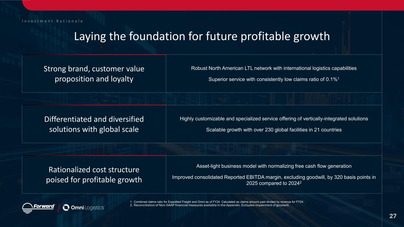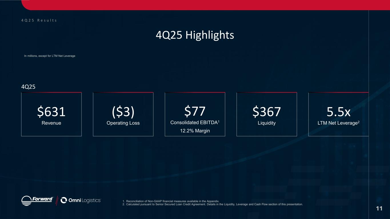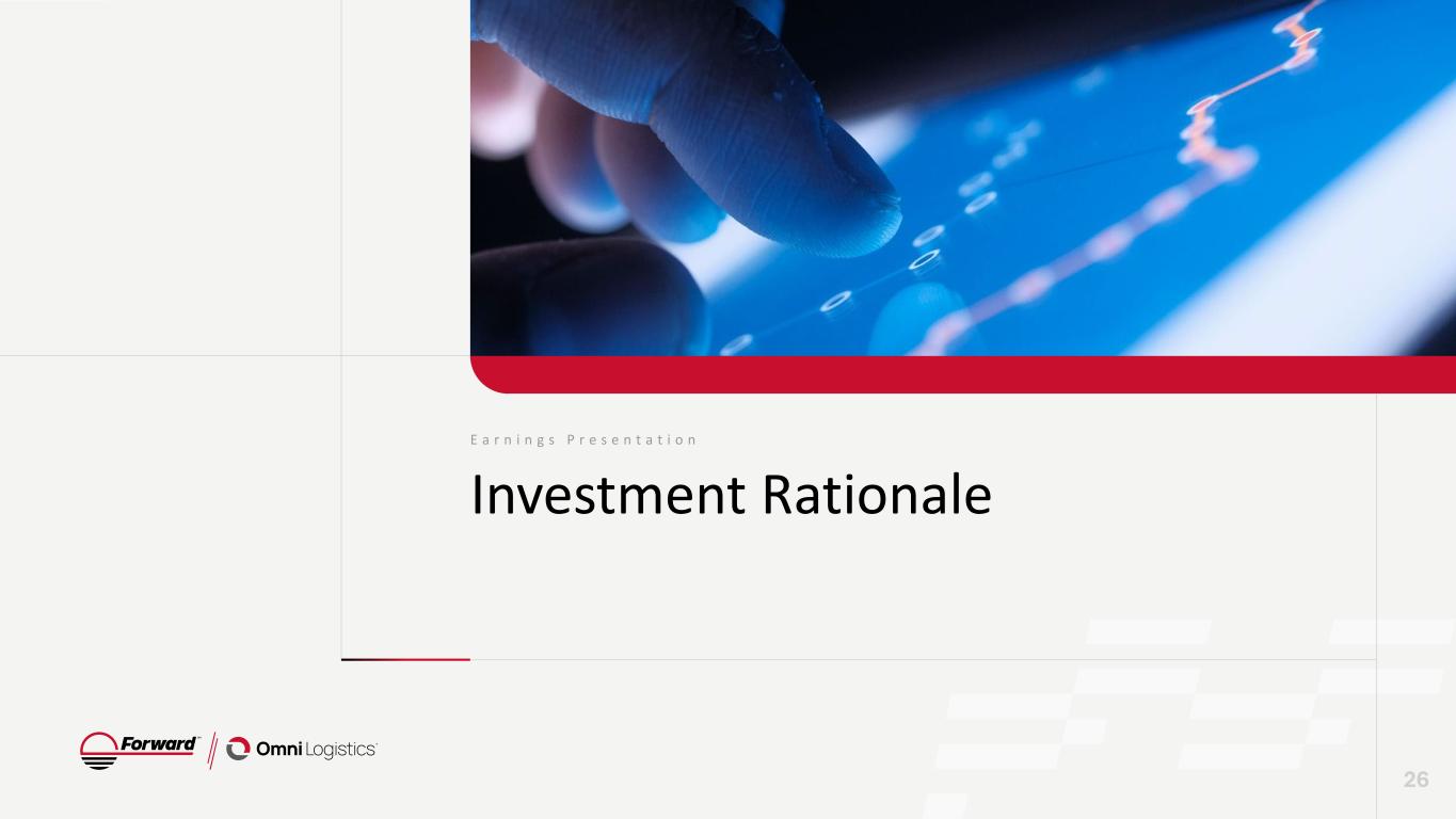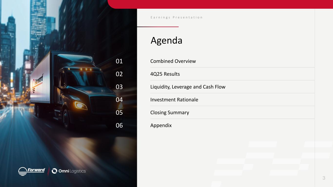 E a r n i n g s P r e s e n t a t i o n Statements & Disclaimers Forward Looking Statements This presentation contains “forward-looking statements” within the meaning of the safe harbor provisions of the U.S. Private Securities Litigation Reform Act of 1995. Forward-looking statements can be identified by words such as: “anticipate,” “intend,” “plan,” “goal,” “seek,” “believe,” “project,” “estimate,” “expect,” “strategy,” “future,” “likely,” “may,” “should,” “will” and similar references to future periods. Forward-looking statements included in this presentation relate to: expectations regarding customer demand for services of Forward Air Corporation (“Forward,” “we,” “us” or “our”); our outlook on the freight market; our expectations regarding operational and administrative transformations after the Omni acquisition, including consolidating systems and upgrading our technology through our One ERP initiative; our projections with respect to revenue growth following the realization of such synergies; our goals to achieve sustainable growth and long-term profitability; our plans to transition to financial reporting by product and service, consisting of ground, intermodal, air and ocean, and warehousing and value-added services; our plans to improve and prioritize liquidity and cash generation; our expectations and beliefs regarding the strategic alternative process and our intentions with respect to our future disclosure on the process; our beliefs regarding the ability to drive sustainable growth amidst an uncertain macroeconomic landscape; the impact of tariffs on our business; and expectations regarding our sales channel operations and results related to our One Ground Network. Forward-looking statements are neither historical facts nor assurances of future performance. Instead, they are based only on our current beliefs, expectations and assumptions regarding the future of our business, future plans and strategies, projections, anticipated events and trends, the economy and other future conditions. Because forward-looking statements relate to the future, they are subject to inherent uncertainties, risks and changes in circumstances that are difficult to predict and many of which are outside of our control. Our actual results and financial condition may differ materially from those indicated in the forward-looking statements. The following is a list of factors, among others, that could cause actual results to differ materially from those contemplated by the forward-looking statements: economic factors such as recessions, inflation, higher interest rates and downturns in customer business cycles, the timing of our review of strategic alternatives; our ability to execute on material aspects of any strategic alternatives that are identified and pursued; our ability to achieve ongoing strategic, financial and other benefits as we continue to transform our business after the acquisition of Omni Logistics, including the realization of expected synergies and the achievement of deleveraging targets within the expected timeframes or at all; the risk that the businesses will not be integrated successfully or that integration may be more difficult, time-consuming or costly than expected, the risk that operating costs, customer loss, management and employee retention and business disruption (including, without limitation, difficulties in maintaining relationships with employees, customers, clients or suppliers) as a result of the acquisition of Omni Logistics may be greater than expected, continued weakening of the freight environment, future debt and financing levels, our ability to deleverage, including, without limitation, through capital allocation or divestitures of non-core businesses, our ability to secure terminal facilities in desirable locations at reasonable rates, more limited liquidity than expected which limits our ability to make key investments, the creditworthiness of our customers and their ability to pay for services rendered, our inability to maintain our historical growth rate because of a decreased volume of freight or decreased average revenue per pound of freight moving through our network, the availability and compensation of qualified Leased Capacity Providers and freight handlers as well as contracted, third-party carriers needed to serve our customers’ transportation needs, our inability to manage our information systems and inability of our information systems to handle an increased volume of freight moving through our network, the occurrence of cybersecurity risks and events, market acceptance of our service offerings, claims for property damage, personal injuries or workers’ compensation, enforcement of and changes in governmental regulations, environmental, tax, insurance and accounting matters, the handling of hazardous materials, changes in fuel prices, loss of a major customer, increasing competition, and pricing pressure, evolving macroeconomic factors, including the imposition of additional tariffs, potential escalation from trading partners, the uncertainty surrounding trade policy, including the extent to which increased tariffs will affect our operations and strategic plan, and our limited visibility into the impact of tariffs on third-party shipments, our dependence on our senior management team and the potential effects of changes in employee status, seasonal trends, the occurrence of certain weather events, restrictions in our charter and bylaws and the risks described in our Annual Report on Form 10-K for the year ended December 31, 2024, and as may be identified in our subsequent Quarterly Reports on Form 10-Q and Current Reports on Form 8-K. We caution readers that any forward-looking statement made by us in this presentation is based only on information currently available to us and they should not place undue reliance on any forward-looking statement, which reflect man