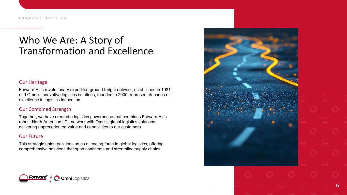 C o m b i n e d O v e r v i e w Who We Are: A Story of Transformation and Excellence Our Heritage Forward Air's revolutionary expedited ground freight network, established in 1981, and Omni’s innovative logistics solutions, founded in 2000, represent decades of excellence in logistics innovation. Our Combined Strength Together, we have created a logistics powerhouse that combines Forward Air's robust North American LTL network with Omni's global logistics solutions, delivering unprecedented value and capabilities to our customers. Our Future This strategic union positions us as a leading force in global logistics, offering comprehensive solutions that span continents and streamline supply chains. 5