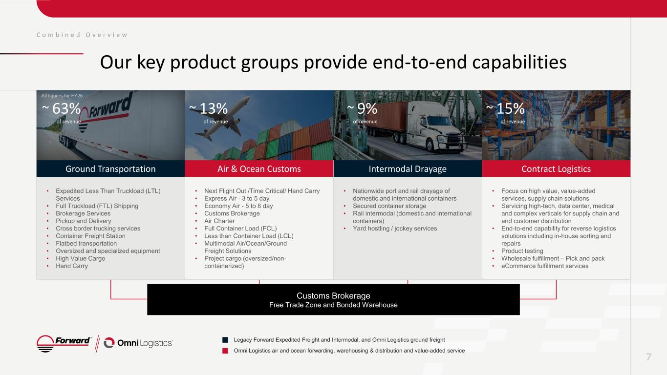 C o m b i n e d O v e r v i e w By the Numbers $2.5B FY 2025 Revenue $307M FY 2025 CEBITDA1 6K+ Total Employees 2K+ Freight Handlers2 3.7M+ Total Shipments3 0.1% Claims Ratio4 230+ Global Facilities 21 Countries 6 1. Consolidated EBITDA (“CEBITDA”). Reconciliation of Non-GAAP financial measures available in the Appendix. 2. Freight handlers included in Total Employees. 3. Total Ground, Intermodal, Air and Ocean shipments per year managed by Expedited Freight, Omni Logistics and Intermodal segments. 4. Combined claims ratio for Expedited Freight and Omni Logistics. Calculated as claims amount paid divided by revenue for FY25. All figures for FY25