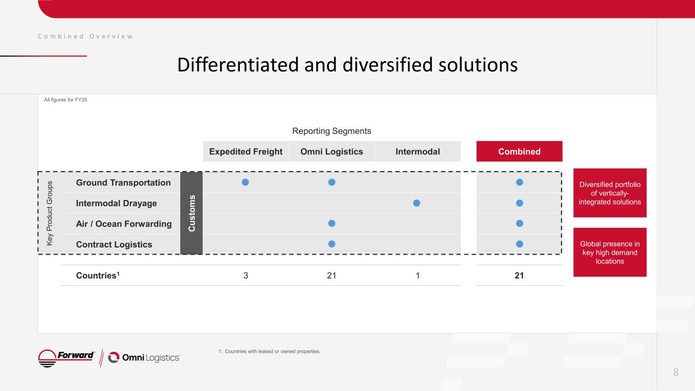 Ground Transportation Air & Ocean Customs Intermodal Drayage Contract Logistics • Expedited Less Than Truckload (LTL) Services • Full Truckload (FTL) Shipping • Brokerage Services • Pickup and Delivery • Cross border trucking services • Container Freight Station • Flatbed transportation • Oversized and specialized equipment • High Value Cargo • Hand Carry • Next Flight Out /Time Critical/ Hand Carry • Express Air - 3 to 5 day • Economy Air - 5 to 8 day • Customs Brokerage • Air Charter • Full Container Load (FCL) • Less than Container Load (LCL) • Multimodal Air/Ocean/Ground Freight Solutions • Project cargo (oversized/non- containerized) • Nationwide port and rail drayage of domestic and international containers • Secured container storage • Rail intermodal (domestic and international containers) • Yard hostling / jockey services • Focus on high value, value-added services, supply chain solutions • Servicing high-tech, data center, medical and complex verticals for supply chain and end customer distribution • End-to-end capability for reverse logistics solutions including in-house sorting and repairs • Product testing • Wholesale fulfillment – Pick and pack • eCommerce fulfillment services Customs Brokerage Free Trade Zone and Bonded Warehouse C o m b i n e d O v e r v i e w Our key product groups provide end-to-end capabilities 7 ~ 63% of revenue Legacy Forward Expedited Freight and Intermodal, and Omni Logistics ground freight Omni Logistics air and ocean forwarding, warehousing & distribution and value-added service All figures for FY25 ~ 13% of revenue ~ 9% of revenue ~ 15% of revenue