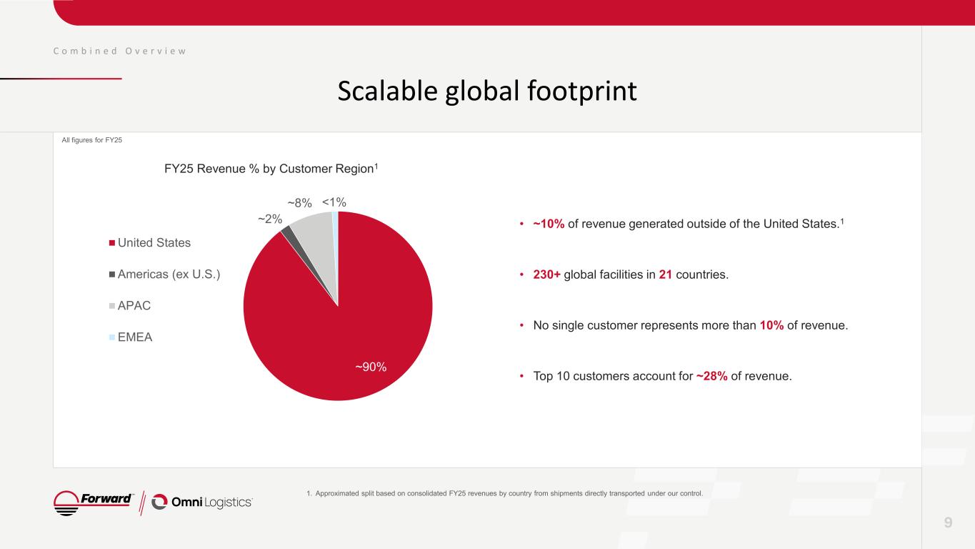 C o m b i n e d O v e r v i e w Differentiated and diversified solutions 8 Reporting Segments Expedited Freight Omni Logistics Intermodal Combined Ke y Pr od uc t G ro up s Ground Transportation C us to m s Intermodal Drayage Air / Ocean Forwarding Contract Logistics Countries1 3 21 1 21 Global presence in key high demand locations Diversified portfolio of vertically- integrated solutions 1. Countries with leased or owned properties. All figures for FY25