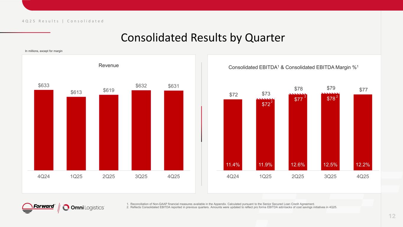 4 Q 2 5 R e s u l t s 4Q25 Highlights 4Q25 $631 Revenue ($3) Operating Loss $77 Consolidated EBITDA1 12.2% Margin $367 Liquidity 5.5x LTM Net Leverage2 11 1. Reconciliation of Non-GAAP financial measures available in the Appendix. 2. Calculated pursuant to Senior Secured Loan Credit Agreement. Details in the Liquidity, Leverage and Cash Flow section of this presentation. In millions, except for LTM Net Leverage