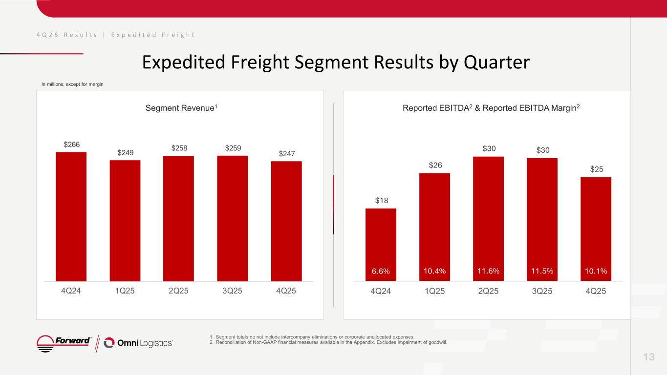 4 Q 2 5 R e s u l t s | E x p e d i t e d F r e i g h t Expedited Freight Segment Results by Quarter 1. Segment totals do not include intercompany eliminations or corporate unallocated expenses. 2. Reconciliation of Non-GAAP financial measures available in the Appendix. Excludes impairment of goodwill. Segment Revenue1 Reported EBITDA2 & Reported EBITDA Margin2 13 In millions, except for margin $266 $249 $258 $259 $247 4Q24 1Q25 2Q25 3Q25 4Q25 $18 $26 $30 $30 $25 6.6% 10.4% 11.6% 11.5% 10.1% 4Q24 1Q25 2Q25 3Q25 4Q25