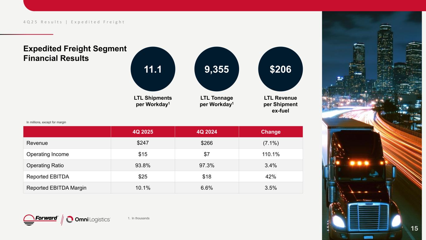 4 Q 2 5 R e s u l t s | E x p e d i t e d F r e i g h t Expedited Freight Segment: Year over year pricing and margin improvement 14 Revenue per CWT, ex fuel1,2 & Reported EBITDA Margin3 Revenue per Shipment, ex fuel1,2 & Reported EBITDA Margin3 $23.74 $24.76 $24.82 $24.98 $24.30 6.6% 10.4% 11.6% 11.5% 10.1% 4Q24 1Q25 2Q25 3Q25 4Q25 Revenue per CWT, ex fuel Reported EBITDA Margin +2.4% $203 $208 $209 $210 $206 6.6% 10.4% 11.6% 11.5% 10.1% 4Q24 1Q25 2Q25 3Q25 4Q25 Revenue per Shipment, ex fuel Reported EBITDA Margin +1.2% 1. Excludes accessorial and Truckload products. 2. Includes intercompany revenue between the Network and Truckload revenue streams. 3. Reconciliation of Non-GAAP financial measures available in the Appendix. • Corrective pricing action implemented in 4Q24. • Year-over-year pricing improvement. • 350 bps margin improvement year over year