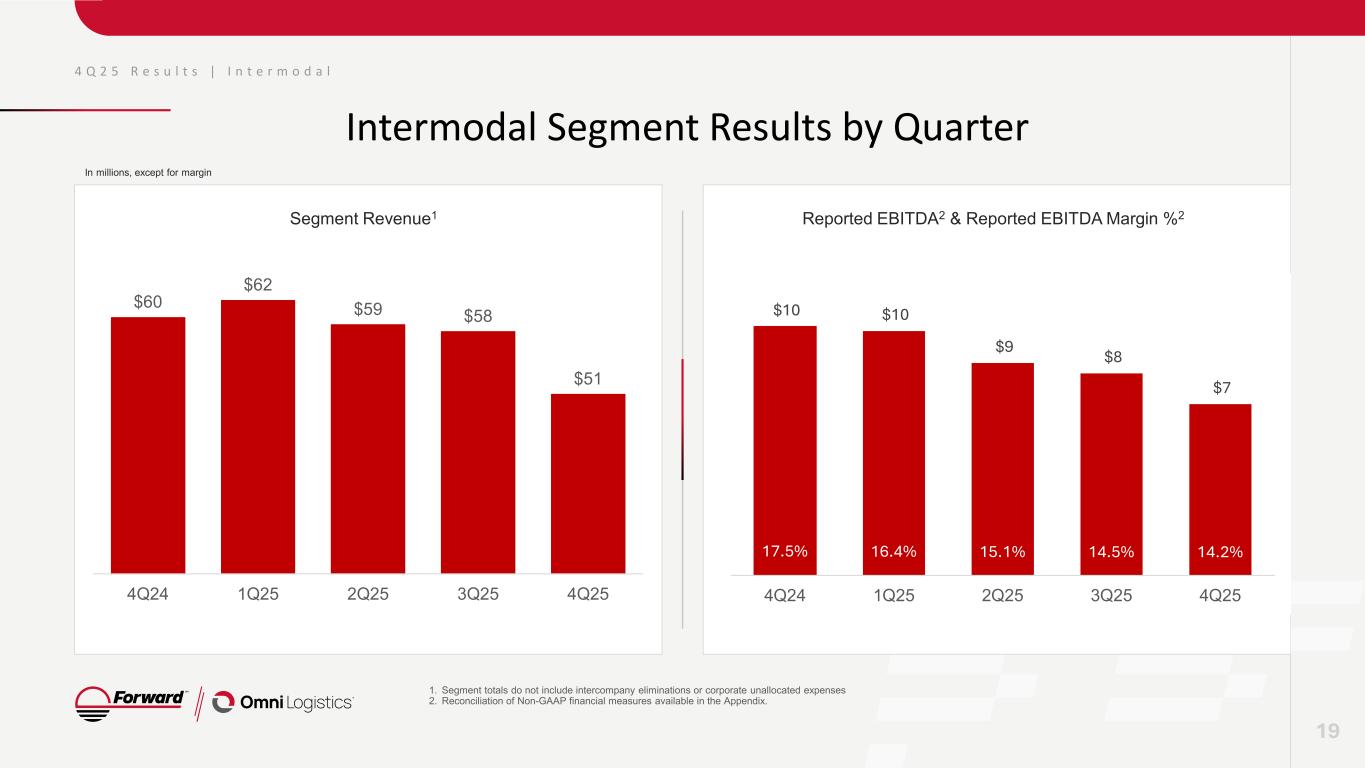 Omni Segment Financial Results 4Q 2025 4Q 2024 Change Revenue $360 $326 10.5% Operating Income $10 $91 4.2% Operating Ratio 97.3% 97.1%1 (0.2%) Reported EBITDA $36 $321 12.0% Reported EBITDA Margin 10.0% 9.8%1 0.1% 4 Q 2 5 R e s u l t s | O m n i L o g i s t i c s In millions, except for margin 18 1. Operating Income, Operating Ratio, Reported EBITDA and Reported EBITDA Margin shown excluding impairment of goodwill.