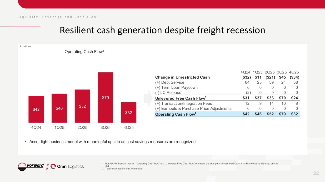 $42 $46 $52 $79 $32 4Q24 1Q25 2Q25 3Q25 4Q25 L i q u i d i t y , L e v e r a g e a n d C a s h F l o w Resilient cash generation despite freight recession 1. Non-GAAP financial metrics. “Operating Cash Flow” and “Unlevered Free Cash Flow” represent the change in Unrestricted Cash less discrete items identified on this slide. 2. Totals may not foot due to rounding. 22 • Asset-light business model with meaningful upside as cost savings measures are recognized Operating Cash Flow1 In millions 4Q24 1Q25 2Q25 3Q25 4Q25 Change in Unrestricted Cash ($32) $11 ($21) $45 ($34) (+) Debt Service 64 25 59 24 58 (+) Term Loan Paydown 0 0 0 0 0 (-) LC Release (2) 0 0 0 0 Unlevered Free Cash Flow1 $31 $37 $38 $70 $24 (+) Transaction/Integration Fees 12 9 14 10 8 (+) Earnouts & Purchase Price Adjustments 0 0 0 0 0 Operating Cash Flow1 $42 $46 $52 $79 $32