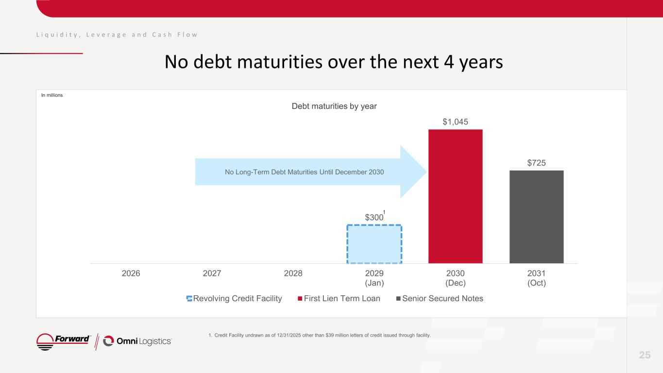 $277 $277 $273 $273 $261 $86 $101 $79 $123 $91 $0 <$1 <$1 $19 $15 $16 $17 $15 4Q24 1Q25 2Q25 3Q25 4Q25 L i q u i d i t y , L e v e r a g e a n d C a s h F l o w Liquidity and Leverage Net Leverage1 Net Leverage Ratio1 Required Covenant Leverage Ratio1 Net Cash1,3 Revolving Credit Facility4 Restricted Cash Deduction Foreign Subsidiary Deduction * 24 * * * * 1. Calculated pursuant to Senior Secured Loan Credit Agreement. 2. Includes Term Loan, Senior Secured Notes, and Revolving Credit Facility, excludes finance leases. 3. Excludes foreign subsidiaries and restricted cash. 4. Undrawn revolver balance. 5. Totals may not foot due to rounding. In millions 5.5x 5.3x 5.7x 5.5x 5.5x 6.50x 4Q24 1Q25 2Q25 3Q25 4Q25 Liquidity5 $382 $393 $368 $413 $367 Gross Cash* $105 $117 $95 $140 $106 in millions 4Q24 1Q25 2Q25 3Q25 4Q25 Term Loan B $1,045 $1,045 $1,045 $1,045 $1,045 Senior Sec. Notes $725 $725 $725 $725 $725 First Lien Debt2 $1,770 $1,770 $1,770 $1,770 $1,770 Net Cash1,3 86 101 79 123 91 Net Debt 1,684 1,669 1,691 1,647 1,679 Consolidated LTM EBITDA1 311 320 309 302 307 Net Leverage Ratio1 5.4x 5.2x 5.5x 5.5x 5.5x