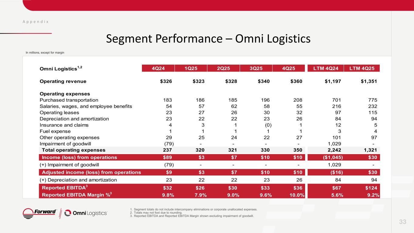 A p p e n d i x Segment Performance – Expedited Freight 32 1. Segment totals do not include intercompany eliminations or corporate unallocated expenses. 2. Totals may not foot due to rounding. In millions, except for margin Expedited Freight1,2 4Q24 1Q25 2Q25 3Q25 4Q25 LTM 4Q24 LTM 4Q25 Operating revenue $266 $249 $258 $259 $247 $1,115 $1,013 Operating expenses Purchased transportation 136 121 124 125 122 546 492 Salaries, wages, and employee benefits 57 53 54 54 50 242 210 Operating leases 18 15 17 16 16 64 64 Depreciation and amortization 10 10 10 10 10 41 41 Insurance and claims 10 10 11 10 9 44 41 Fuel expense 3 2 3 2 2 10 9 Other operating expenses 24 22 19 21 24 100 86 Total operating expenses 259 234 238 239 232 1,047 943 Income (loss) from operations $7 $16 $20 $19 $15 $68 $70 (+) Depreciation and amortization 10 10 10 10 10 41 41 Reported EBITDA $18 $26 $30 $30 $25 109 111 Reported EBITDA Margin % 6.6% 10.4% 11.6% 11.5% 10.1% 9.8% 10.9%