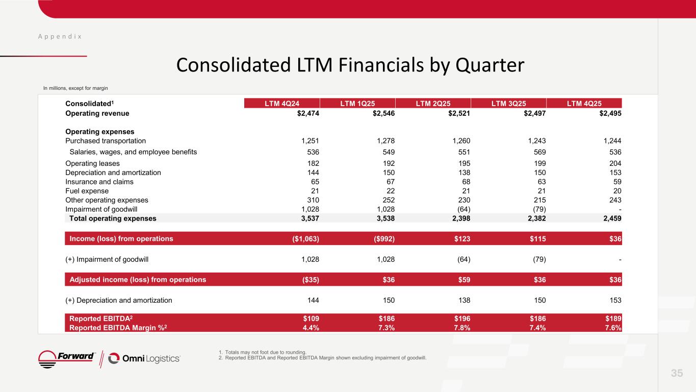 A p p e n d i x Segment Performance – Intermodal 34 1. Segment totals do not include intercompany eliminations or corporate unallocated expenses. 2. Totals may not foot due to rounding. In millions, except for margin Intermodal1,2 4Q24 1Q25 2Q25 3Q25 4Q25 LTM 4Q24 LTM 4Q25 Operating revenue $60 $62 $59 $58 $51 $233 $231 Operating expenses Purchased transportation 19 20 20 19 17 74 77 Salaries, wages, and employee benefits 14 16 15 14 12 59 58 Operating leases 6 6 5 6 5 22 22 Depreciation and amortization 5 5 5 4 4 18 18 Insurance and claims 2 3 3 3 3 10 12 Fuel expense 2 2 2 2 1 9 7 Other operating expenses 5 5 4 5 5 23 20 Total operating expenses 54 57 55 54 48 214 214 Income (loss) from operations $6 $6 $4 $4 $3 $19 $17 (+) Depreciation and amortization 5 5 5 4 4 18 18 Reported EBITDA $10 $10 $9 $8 $7 $37 $35 Reported EBITDA Margin % 17.5% 16.4% 15.1% 14.5% 14.2% 16.0% 15.1%