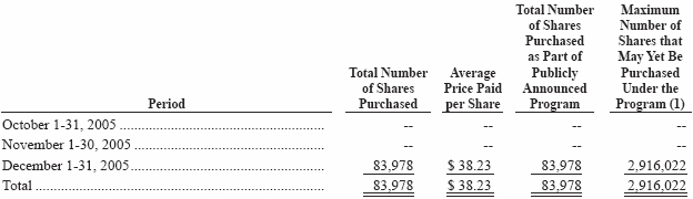 Repurchase of Common Stock On July 25, 2002, the Company announced that its Board of Directors approved a stock repurchase program for up to 3.0 million shares of common stock (the 2002 Repurchase Plan). During the third quarter of 2005, the Company completed the repurchase of the shares authorized under the 2002 Repurchase Plan. On November 17, 2005, the Company announced that its Board of Directors approved a stock repurchase program for up to 3.0 million shares of common stock (the 2005 Repurchase Plan). For the year ended December 31, 2005, the Company repurchased approximately 1.7 million shares of common stock under both the 2002 Repurchase Plan and the 2005 Repurchase Plan for $52.3 million, or $30.92 per share.