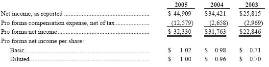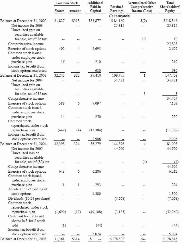 The tax benefits associated with the exercise of stock options during the years ended December 31, 2005, 2004 and 2003 were $5.1 million, $2.9 million and $0.6 million, respectively, and are reflected as an increase in additional paid-in capital in the accompanying consolidated statements of shareholders equity.