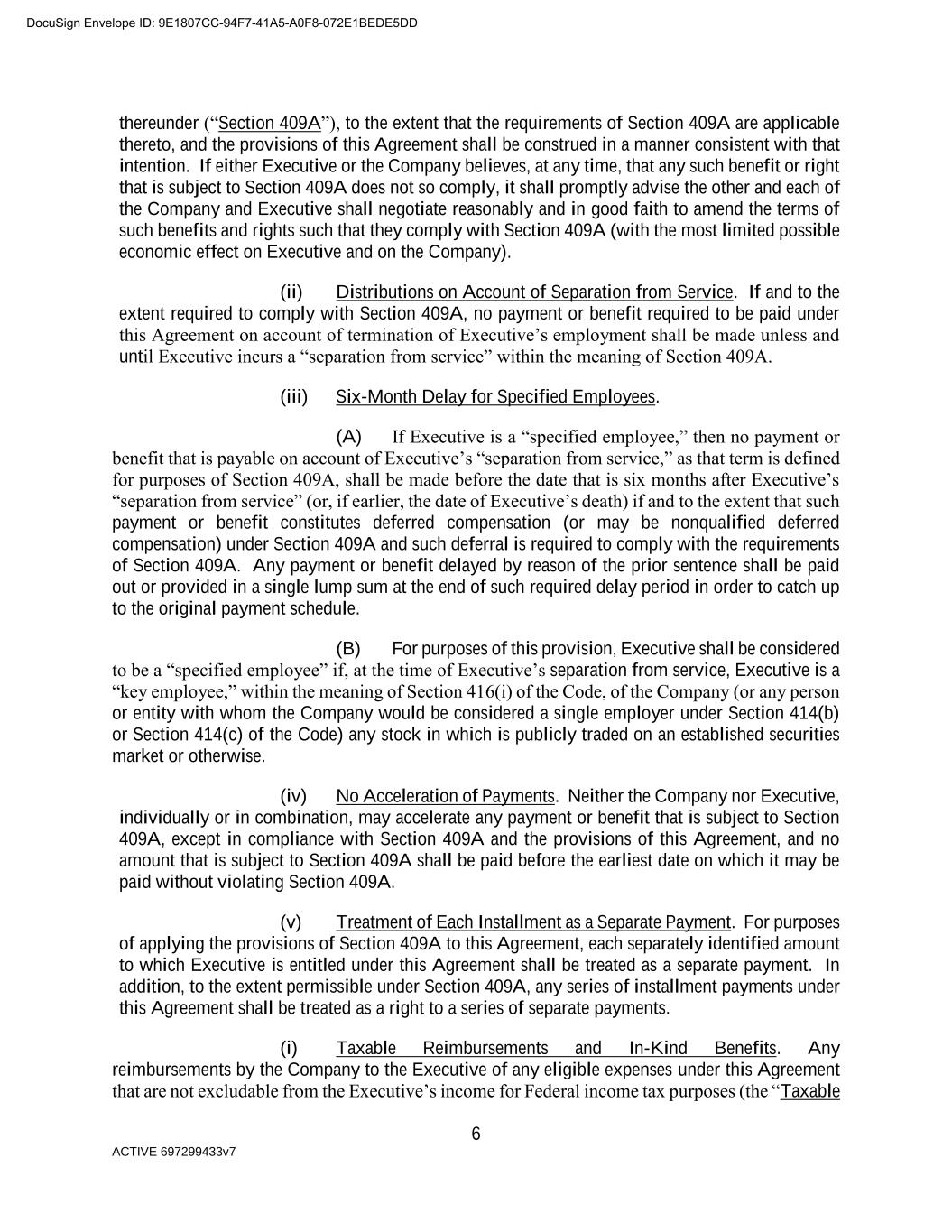 6 ACTIVE 697299433v7 thereunder (“Section 409A”), to the extent that the requirements of Section 409A are applicable thereto, and the provisions of this Agreement shall be construed in a manner consistent with that intention. If either Executive or the Company believes, at any time, that any such benefit or right that is subject to Section 409A does not so comply, it shall promptly advise the other and each of the Company and Executive shall negotiate reasonably and in good faith to amend the terms of such benefits and rights such that they comply with Section 409A (with the most limited possible economic effect on Executive and on the Company). (ii) Distributions on Account of Separation from Service. If and to the extent required to comply with Section 409A, no payment or benefit required to be paid under this Agreement on account of termination of Executive’s employment shall be made unless and until Executive incurs a “separation from service” within the meaning of Section 409A. (iii) Six-Month Delay for Specified Employees. (A) If Executive is a “specified employee,” then no payment or benefit that is payable on account of Executive’s “separation from service,” as that term is defined for purposes of Section 409A, shall be made before the date that is six months after Executive’s “separation from service” (or, if earlier, the date of Executive’s death) if and to the extent that such payment or benefit constitutes deferred compensation (or may be nonqualified deferred compensation) under Section 409A and such deferral is required to comply with the requirements of Section 409A. Any payment or benefit delayed by reason of the prior sentence shall be paid out or provided in a single lump sum at the end of such required delay period in order to catch up to the original payment schedule. (B) For purposes of this provision, Executive shall be considered to be a “specified employee” if, at the time of Executive’s separation from service, Executive is a “key employee,” within the meaning of Section 416(i) of the Code, of the Company (or any person or entity with whom the Company would be considered a single employer under Section 414(b) or Section 414(c) of the Code) any stock in which is publicly traded on an established securities market or otherwise. (iv) No Acceleration of Payments. Neither the Company nor Executive, individually or in combination, may accelerate any payment or benefit that is subject to Section 409A, except in compliance with Section 409A and the provisions of this Agreement, and no amount that is subject to Section 409A shall be paid before the earliest date on which it may be paid without violating Section 409A. (v) Treatment of Each Installment as a Separate Payment. For purposes of applying the provisions of Section 409A to this Agreement, each separately identified amount to which Executive is entitled under this Agreement shall be treated as a separate payment. In addition, to the extent permissible under Section 409A, any series of installment payments under this Agreement shall be treated as a right to a series of separate payments. (i) Taxable Reimbursements and In-Kind Benefits. Any reimbursements by the Company to the Executive of any eligible expenses under this Agreement that are not excludable from the Executive’s income for Federal income tax purposes (the “Taxable DocuSign Envelope ID: 38FDB16B-5C99-4998-9E9E-83949C5C3F8B9E1807CC 94F7 1A5 A0F8 072E1BEDE5DD