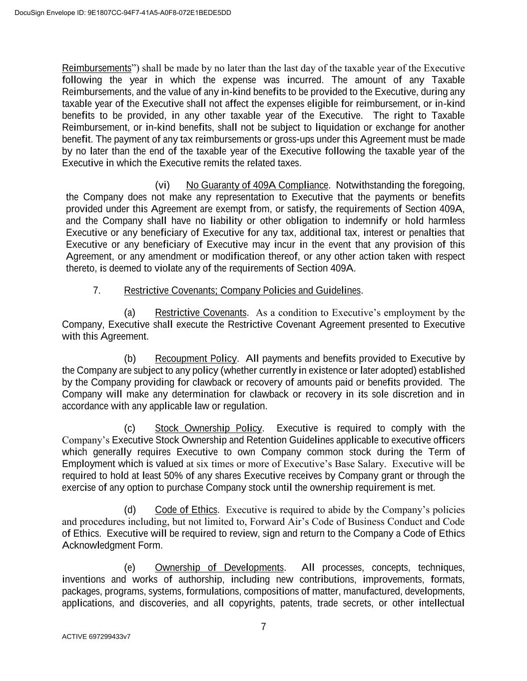7 ACTIVE 697299433v7 Reimbursements”) shall be made by no later than the last day of the taxable year of the Executive following the year in which the expense was incurred. The amount of any Taxable Reimbursements, and the value of any in-kind benefits to be provided to the Executive, during any taxable year of the Executive shall not affect the expenses eligible for reimbursement, or in-kind benefits to be provided, in any other taxable year of the Executive. The right to Taxable Reimbursement, or in-kind benefits, shall not be subject to liquidation or exchange for another benefit. The payment of any tax reimbursements or gross-ups under this Agreement must be made by no later than the end of the taxable year of the Executive following the taxable year of the Executive in which the Executive remits the related taxes. (vi) No Guaranty of 409A Compliance. Notwithstanding the foregoing, the Company does not make any representation to Executive that the payments or benefits provided under this Agreement are exempt from, or satisfy, the requirements of Section 409A, and the Company shall have no liability or other obligation to indemnify or hold harmless Executive or any beneficiary of Executive for any tax, additional tax, interest or penalties that Executive or any beneficiary of Executive may incur in the event that any provision of this Agreement, or any amendment or modification thereof, or any other action taken with respect thereto, is deemed to violate any of the requirements of Section 409A. 7. Restrictive Covenants; Company Policies and Guidelines. (a) Restrictive Covenants. As a condition to Executive’s employment by the Company, Executive shall execute the Restrictive Covenant Agreement presented to Executive with this Agreement. (b) Recoupment Policy. All payments and benefits provided to Executive by the Company are subject to any policy (whether currently in existence or later adopted) established by the Company providing for clawback or recovery of amounts paid or benefits provided. The Company will make any determination for clawback or recovery in its sole discretion and in accordance with any applicable law or regulation. (c) Stock Ownership Policy. Executive is required to comply with the Company’s Executive Stock Ownership and Retention Guidelines applicable to executive officers which generally requires Executive to own Company common stock during the Term of Employment which is valued at six times or more of Executive’s Base Salary. Executive will be required to hold at least 50% of any shares Executive receives by Company grant or through the exercise of any option to purchase Company stock until the ownership requirement is met. (d) Code of Ethics. Executive is required to abide by the Company’s policies and procedures including, but not limited to, Forward Air’s Code of Business Conduct and Code of Ethics. Executive will be required to review, sign and return to the Company a Code of Ethics Acknowledgment Form. (e) Ownership of Developments. All processes, concepts, techniques, inventions and works of authorship, including new contributions, improvements, formats, packages, programs, systems, formulations, compositions of matter, manufactured, developments, applications, and discoveries, and all copyrights, patents, trade secrets, or other intellectual DocuSign Envelope ID: 38FDB16B-5C99-4998-9E9E-83949C5C3F8B9E1807CC 94F7 1A5 A0F8 072E1BEDE5DD