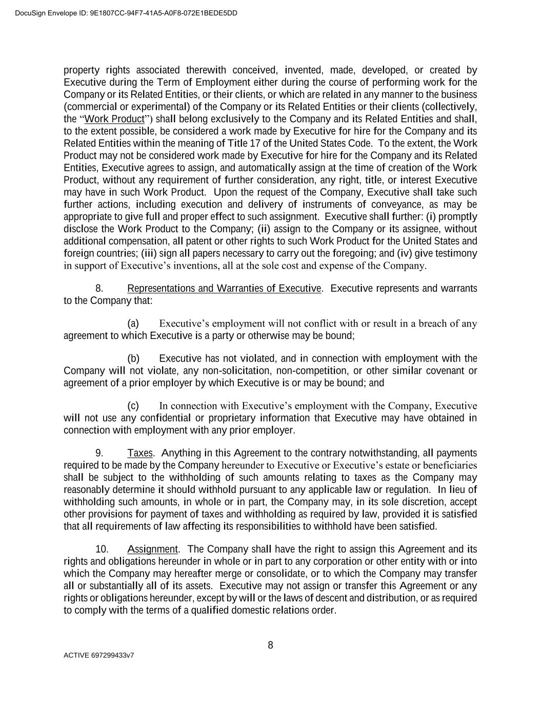 8 ACTIVE 697299433v7 property rights associated therewith conceived, invented, made, developed, or created by Executive during the Term of Employment either during the course of performing work for the Company or its Related Entities, or their clients, or which are related in any manner to the business (commercial or experimental) of the Company or its Related Entities or their clients (collectively, the “Work Product”) shall belong exclusively to the Company and its Related Entities and shall, to the extent possible, be considered a work made by Executive for hire for the Company and its Related Entities within the meaning of Title 17 of the United States Code. To the extent, the Work Product may not be considered work made by Executive for hire for the Company and its Related Entities, Executive agrees to assign, and automatically assign at the time of creation of the Work Product, without any requirement of further consideration, any right, title, or interest Executive may have in such Work Product. Upon the request of the Company, Executive shall take such further actions, including execution and delivery of instruments of conveyance, as may be appropriate to give full and proper effect to such assignment. Executive shall further: (i) promptly disclose the Work Product to the Company; (ii) assign to the Company or its assignee, without additional compensation, all patent or other rights to such Work Product for the United States and foreign countries; (iii) sign all papers necessary to carry out the foregoing; and (iv) give testimony in support of Executive’s inventions, all at the sole cost and expense of the Company. 8. Representations and Warranties of Executive. Executive represents and warrants to the Company that: (a) Executive’s employment will not conflict with or result in a breach of any agreement to which Executive is a party or otherwise may be bound; (b) Executive has not violated, and in connection with employment with the Company will not violate, any non-solicitation, non-competition, or other similar covenant or agreement of a prior employer by which Executive is or may be bound; and (c) In connection with Executive’s employment with the Company, Executive will not use any confidential or proprietary information that Executive may have obtained in connection with employment with any prior employer. 9. Taxes. Anything in this Agreement to the contrary notwithstanding, all payments required to be made by the Company hereunder to Executive or Executive’s estate or beneficiaries shall be subject to the withholding of such amounts relating to taxes as the Company may reasonably determine it should withhold pursuant to any applicable law or regulation. In lieu of withholding such amounts, in whole or in part, the Company may, in its sole discretion, accept other provisions for payment of taxes and withholding as required by law, provided it is satisfied that all requirements of law affecting its responsibilities to withhold have been satisfied. 10. Assignment. The Company shall have the right to assign this Agreement and its rights and obligations hereunder in whole or in part to any corporation or other entity with or into which the Company may hereafter merge or consolidate, or to which the Company may transfer all or substantially all of its assets. Executive may not assign or transfer this Agreement or any rights or obligations hereunder, except by will or the laws of descent and distribution, or as required to comply with the terms of a qualified domestic relations order. DocuSign Envelope ID: 38FDB16B-5C99-4998-9E9E-83949C5C3F8B9E1807CC 94F7 1A5 A0F8 072E1BEDE5DD