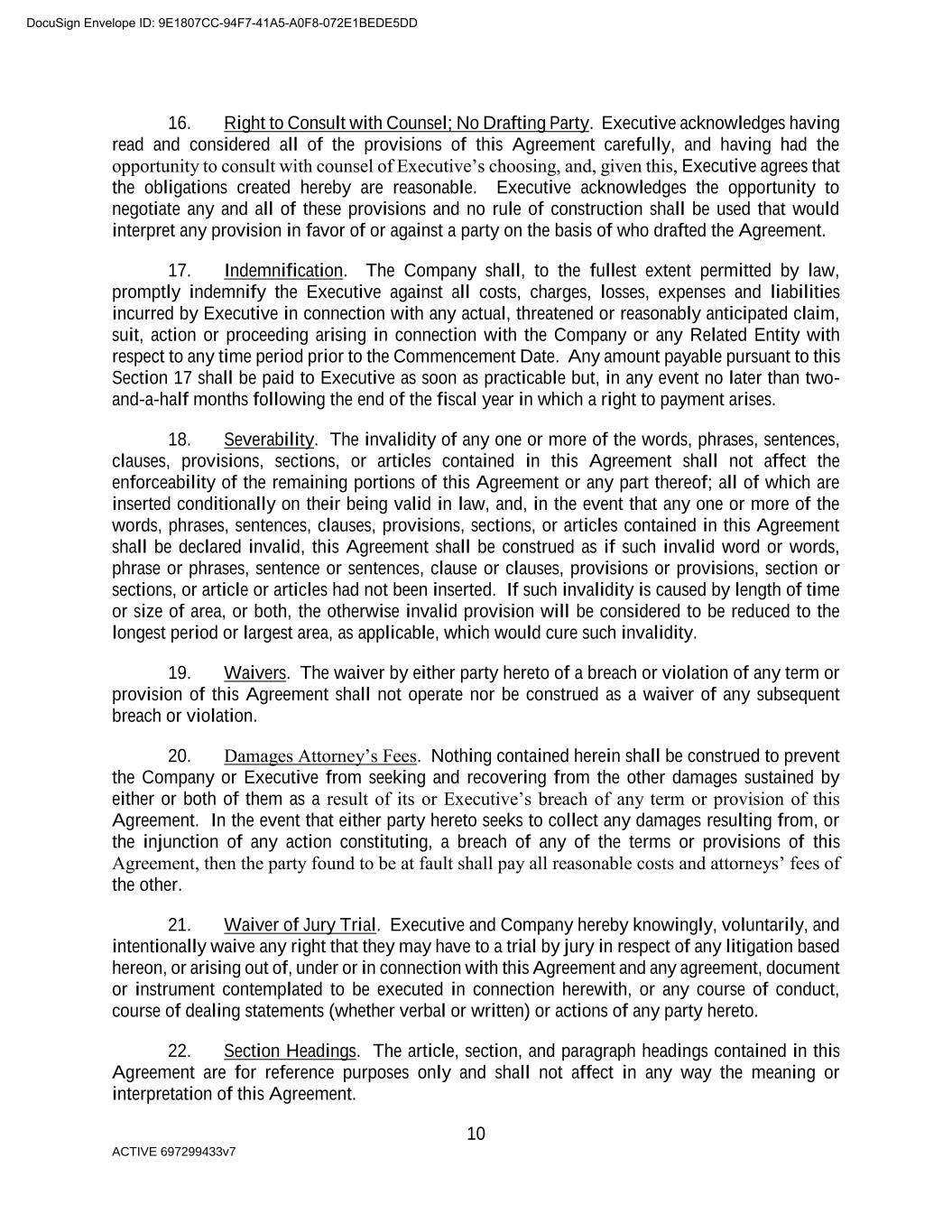 10 ACTIVE 697299433v7 16. Right to Consult with Counsel; No Drafting Party. Executive acknowledges having read and considered all of the provisions of this Agreement carefully, and having had the opportunity to consult with counsel of Executive’s choosing, and, given this, Executive agrees that the obligations created hereby are reasonable. Executive acknowledges the opportunity to negotiate any and all of these provisions and no rule of construction shall be used that would interpret any provision in favor of or against a party on the basis of who drafted the Agreement. 17. Indemnification. The Company shall, to the fullest extent permitted by law, promptly indemnify the Executive against all costs, charges, losses, expenses and liabilities incurred by Executive in connection with any actual, threatened or reasonably anticipated claim, suit, action or proceeding arising in connection with the Company or any Related Entity with respect to any time period prior to the Commencement Date. Any amount payable pursuant to this Section 17 shall be paid to Executive as soon as practicable but, in any event no later than two- and-a-half months following the end of the fiscal year in which a right to payment arises. 18. Severability. The invalidity of any one or more of the words, phrases, sentences, clauses, provisions, sections, or articles contained in this Agreement shall not affect the enforceability of the remaining portions of this Agreement or any part thereof; all of which are inserted conditionally on their being valid in law, and, in the event that any one or more of the words, phrases, sentences, clauses, provisions, sections, or articles contained in this Agreement shall be declared invalid, this Agreement shall be construed as if such invalid word or words, phrase or phrases, sentence or sentences, clause or clauses, provisions or provisions, section or sections, or article or articles had not been inserted. If such invalidity is caused by length of time or size of area, or both, the otherwise invalid provision will be considered to be reduced to the longest period or largest area, as applicable, which would cure such invalidity. 19. Waivers. The waiver by either party hereto of a breach or violation of any term or provision of this Agreement shall not operate nor be construed as a waiver of any subsequent breach or violation. 20. Damages Attorney’s Fees. Nothing contained herein shall be construed to prevent the Company or Executive from seeking and recovering from the other damages sustained by either or both of them as a result of its or Executive’s breach of any term or provision of this Agreement. In the event that either party hereto seeks to collect any damages resulting from, or the injunction of any action constituting, a breach of any of the terms or provisions of this Agreement, then the party found to be at fault shall pay all reasonable costs and attorneys’ fees of the other. 21. Waiver of Jury Trial. Executive and Company hereby knowingly, voluntarily, and intentionally waive any right that they may have to a trial by jury in respect of any litigation based hereon, or arising out of, under or in connection with this Agreement and any agreement, document or instrument contemplated to be executed in connection herewith, or any course of conduct, course of dealing statements (whether verbal or written) or actions of any party hereto. 22. Section Headings. The article, section, and paragraph headings contained in this Agreement are for reference purposes only and shall not affect in any way the meaning or interpretation of this Agreement. DocuSign Envelope ID: 38FDB16B-5C99-4998-9E9E-83949C5C3F8B9E1807CC 94F7 1A5 A0F8 072E1BEDE5DD