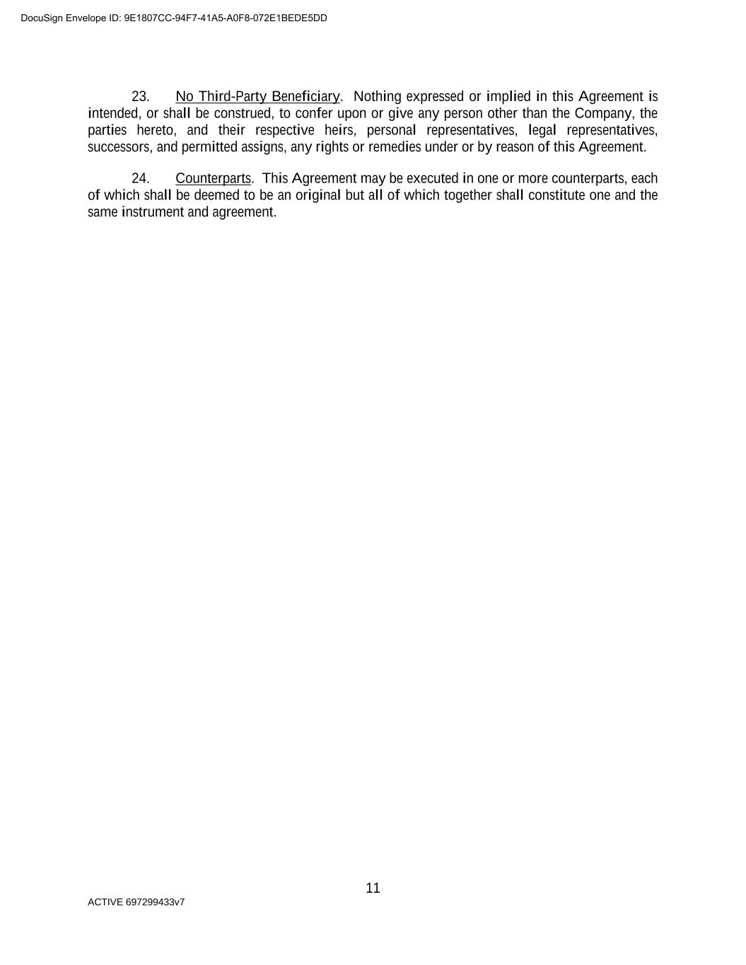 11 ACTIVE 697299433v7 23. No Third-Party Beneficiary. Nothing expressed or implied in this Agreement is intended, or shall be construed, to confer upon or give any person other than the Company, the parties hereto, and their respective heirs, personal representatives, legal representatives, successors, and permitted assigns, any rights or remedies under or by reason of this Agreement. 24. Counterparts. This Agreement may be executed in one or more counterparts, each of which shall be deemed to be an original but all of which together shall constitute one and the same instrument and agreement. DocuSign Envelope ID: 38FDB16B-5C99-4998-9E9E-83949C5C3F8B9E1807CC 94F7 1A5 A0F8 072E1BEDE5DD
