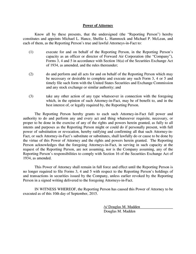 Power of Attorney Know all by these presents, that the undersigned (the “Reporting Person”) hereby constitutes and appoints Michael L. Hance, Shellie L. Hammock and Michael P. McLean, and each of them, as the Reporting Person’s true and lawful Attorneys-in-Fact to: (1) execute for and on behalf of the Reporting Person, in the Reporting Person’s capacity as an officer or director of Forward Air Corporation (the “Company”), Forms 3, 4 and 5 in accordance with Section 16(a) of the Securities Exchange Act of 1934, as amended, and the rules thereunder; (2) do and perform and all acts for and on behalf of the Reporting Person which may be necessary or desirable to complete and execute any such Form 3, 4 or 5 and timely file such form with the United States Securities and Exchange Commission and any stock exchange or similar authority; and (3) take any other action of any type whatsoever in connection with the foregoing which, in the opinion of such Attorney-in-Fact, may be of benefit to, and in the best interest of, or legally required by, the Reporting Person. The Reporting Person hereby grants to each such Attorney-in-Fact full power and authority to do and perform any and every act and thing whatsoever requisite, necessary, or proper to be done in the exercise of any of the rights and powers herein granted, as fully to all intents and purposes as the Reporting Person might or could do if personally present, with full power of substitution or revocation, hereby ratifying and confirming all that such Attorney-in- Fact, or such Attorney-in-Fact’s substitute or substitutes, shall lawfully do or cause to be done by the virtue of this Power of Attorney and the rights and powers herein granted. The Reporting Person acknowledges that the foregoing Attorneys-in-Fact, in serving in such capacity at the request of the Reporting Person, are not assuming, nor is the Company assuming, any of the Reporting Person’s responsibilities to comply with Section 16 of the Securities Exchange Act of 1934, as amended. This Power of Attorney shall remain in full force and effect until the Reporting Person is no longer required to file Forms 3, 4 and 5 with respect to the Reporting Person’s holdings of and transactions in securities issued by the Company, unless earlier revoked by the Reporting Person in a signed writing delivered to the foregoing Attorneys-in-Fact. IN WITNESS WHEREOF, the Reporting Person has caused this Power of Attorney to be executed as of this 10th day of September, 2015. /s/ Douglas M. Madden Douglas M. Madden