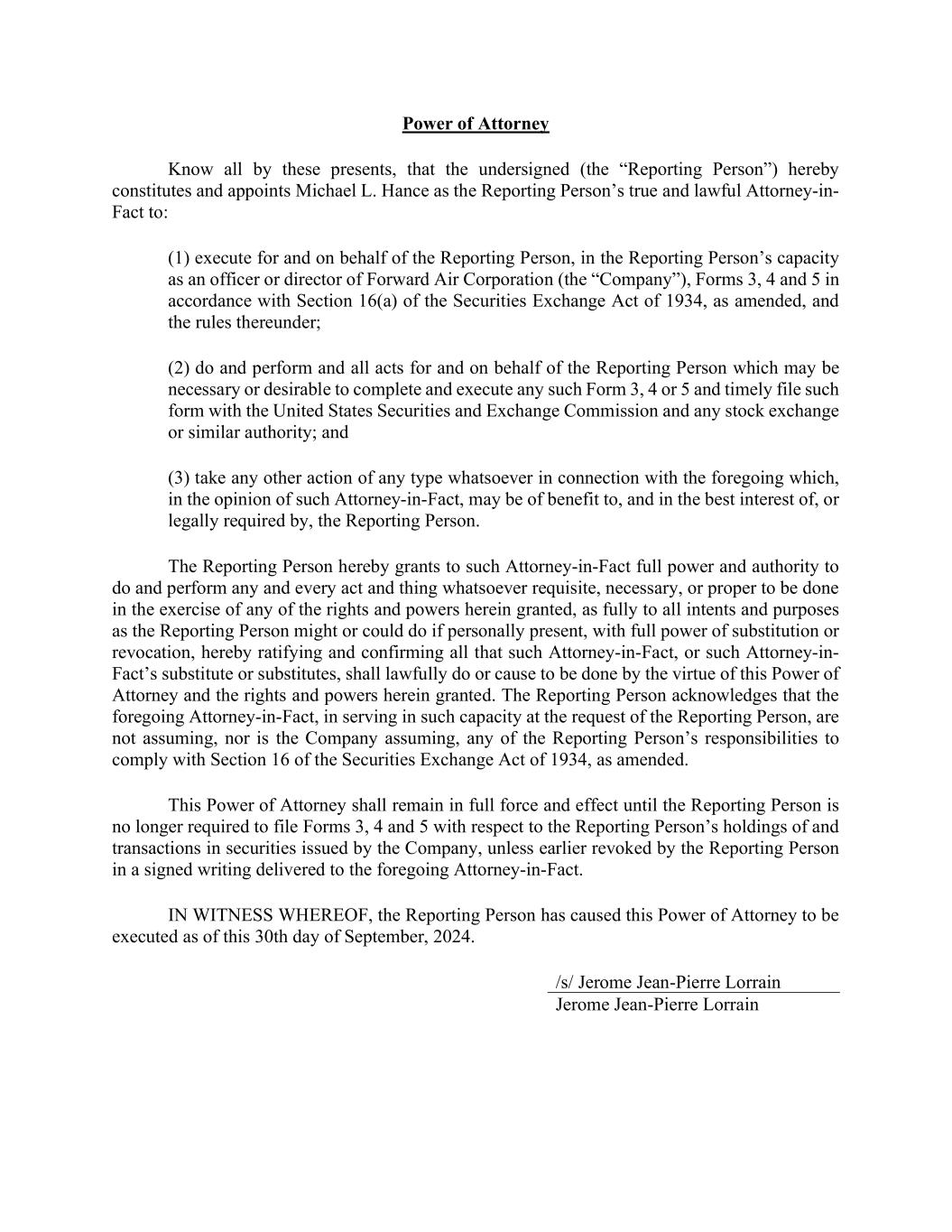 Power of Attorney Know all by these presents, that the undersigned (the “Reporting Person”) hereby constitutes and appoints Michael L. Hance as the Reporting Person’s true and lawful Attorney-in- Fact to: (1) execute for and on behalf of the Reporting Person, in the Reporting Person’s capacity as an officer or director of Forward Air Corporation (the “Company”), Forms 3, 4 and 5 in accordance with Section 16(a) of the Securities Exchange Act of 1934, as amended, and the rules thereunder; (2) do and perform and all acts for and on behalf of the Reporting Person which may be necessary or desirable to complete and execute any such Form 3, 4 or 5 and timely file such form with the United States Securities and Exchange Commission and any stock exchange or similar authority; and (3) take any other action of any type whatsoever in connection with the foregoing which, in the opinion of such Attorney-in-Fact, may be of benefit to, and in the best interest of, or legally required by, the Reporting Person. The Reporting Person hereby grants to such Attorney-in-Fact full power and authority to do and perform any and every act and thing whatsoever requisite, necessary, or proper to be done in the exercise of any of the rights and powers herein granted, as fully to all intents and purposes as the Reporting Person might or could do if personally present, with full power of substitution or revocation, hereby ratifying and confirming all that such Attorney-in-Fact, or such Attorney-in- Fact’s substitute or substitutes, shall lawfully do or cause to be done by the virtue of this Power of Attorney and the rights and powers herein granted. The Reporting Person acknowledges that the foregoing Attorney-in-Fact, in serving in such capacity at the request of the Reporting Person, are not assuming, nor is the Company assuming, any of the Reporting Person’s responsibilities to comply with Section 16 of the Securities Exchange Act of 1934, as amended. This Power of Attorney shall remain in full force and effect until the Reporting Person is no longer required to file Forms 3, 4 and 5 with respect to the Reporting Person’s holdings of and transactions in securities issued by the Company, unless earlier revoked by the Reporting Person in a signed writing delivered to the foregoing Attorney-in-Fact. IN WITNESS WHEREOF, the Reporting Person has caused this Power of Attorney to be executed as of this 30th day of September, 2024. /s/ Jerome Jean-Pierre Lorrain Jerome Jean-Pierre Lorrain